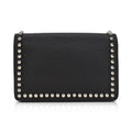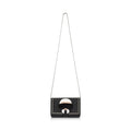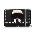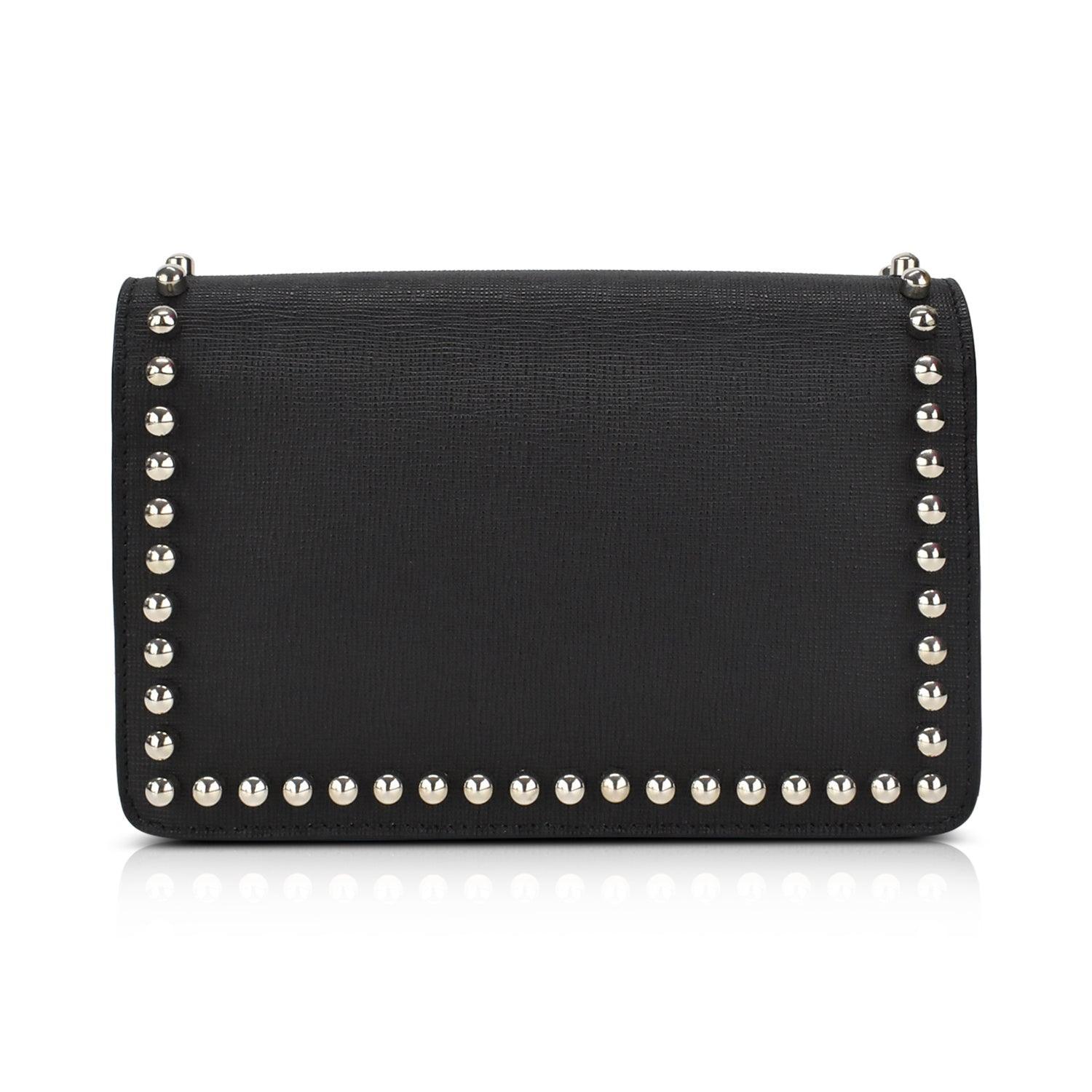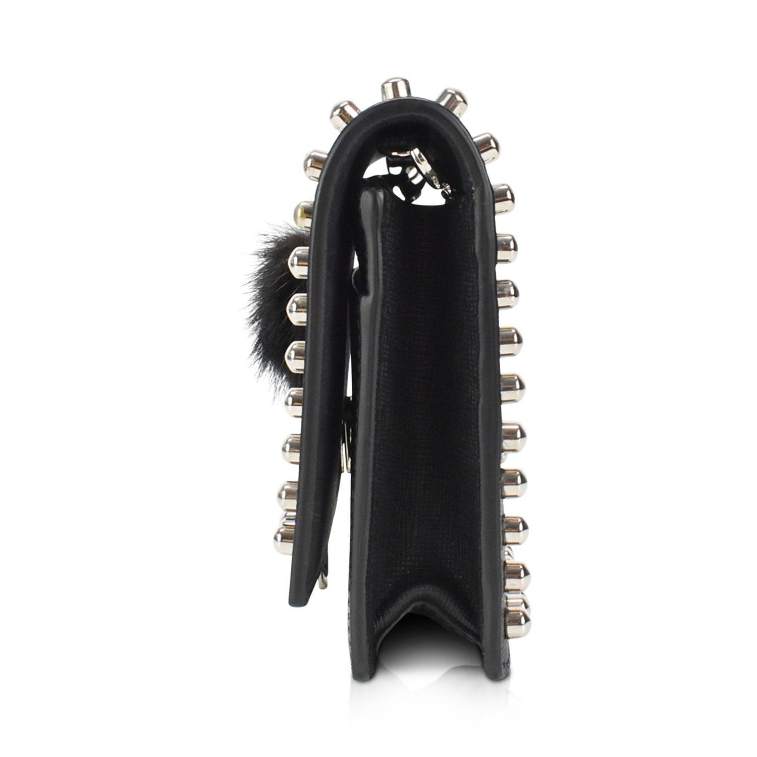 Fendi Crossbody Bag in black leather, front flap push button closure with Karl Lagerfeld graphic and a black mink fur detail. Features silver stud detailing and a silver removable shoulder chain strap. Includes dust bag.
