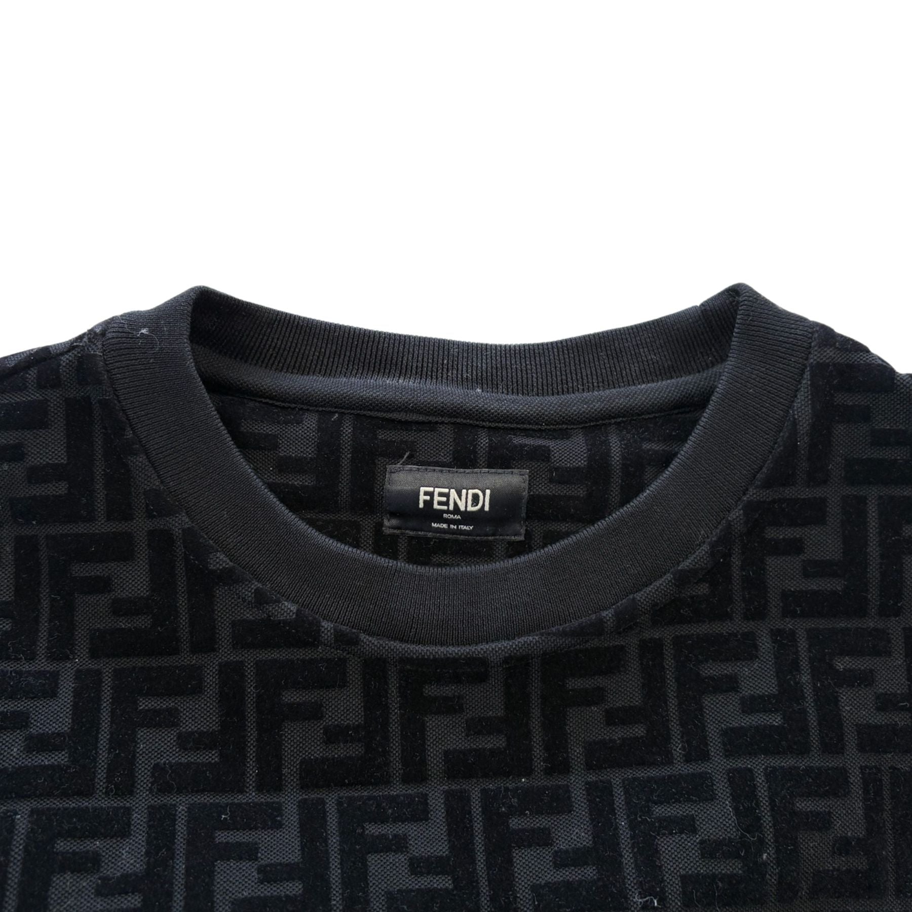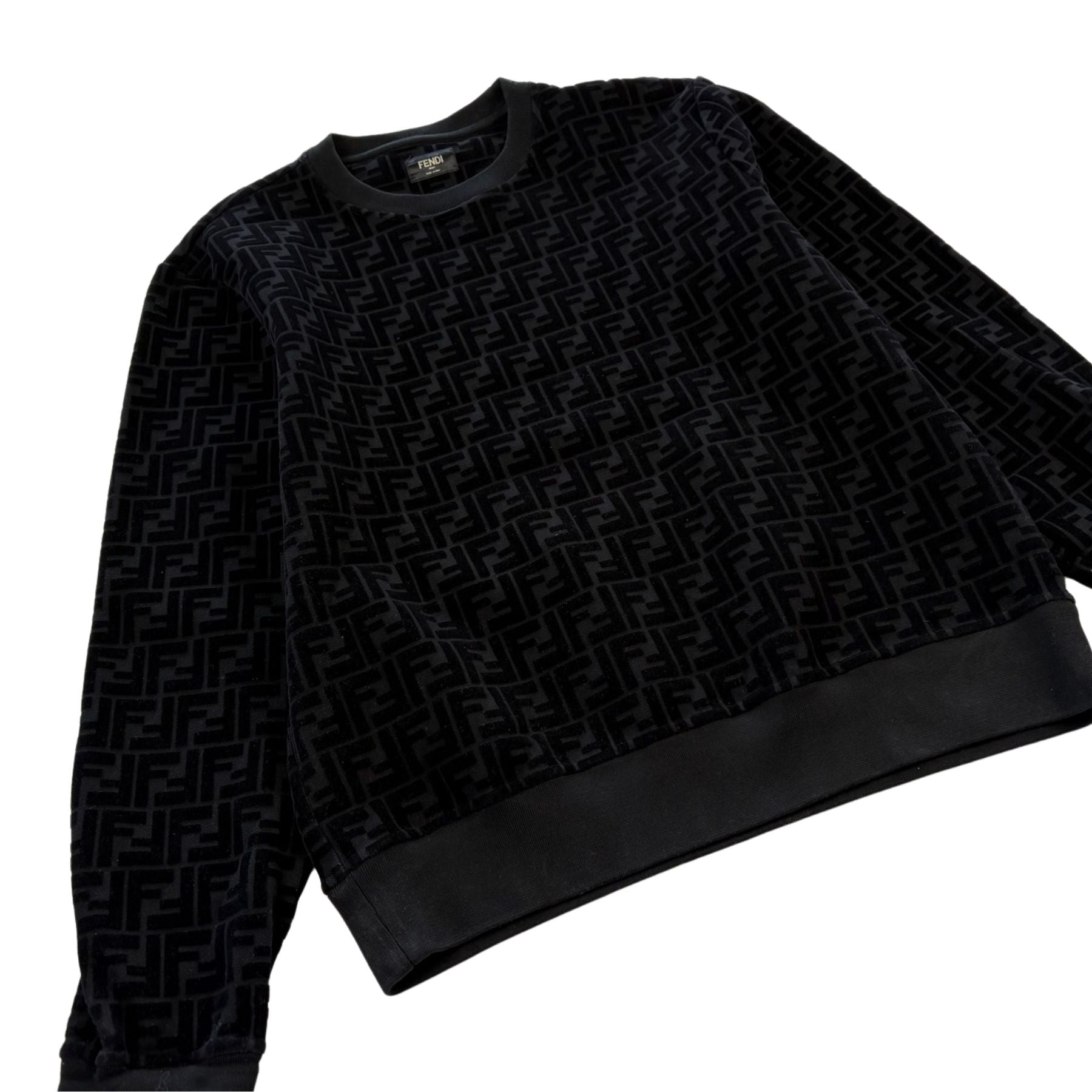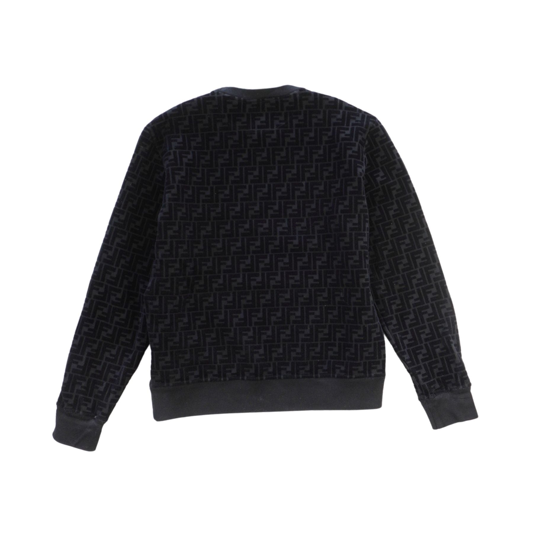 Fendi crewneck sweater in a black FF 'zucca' textured velour printed knit with ribbed cuffs.