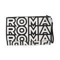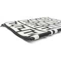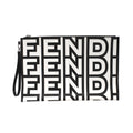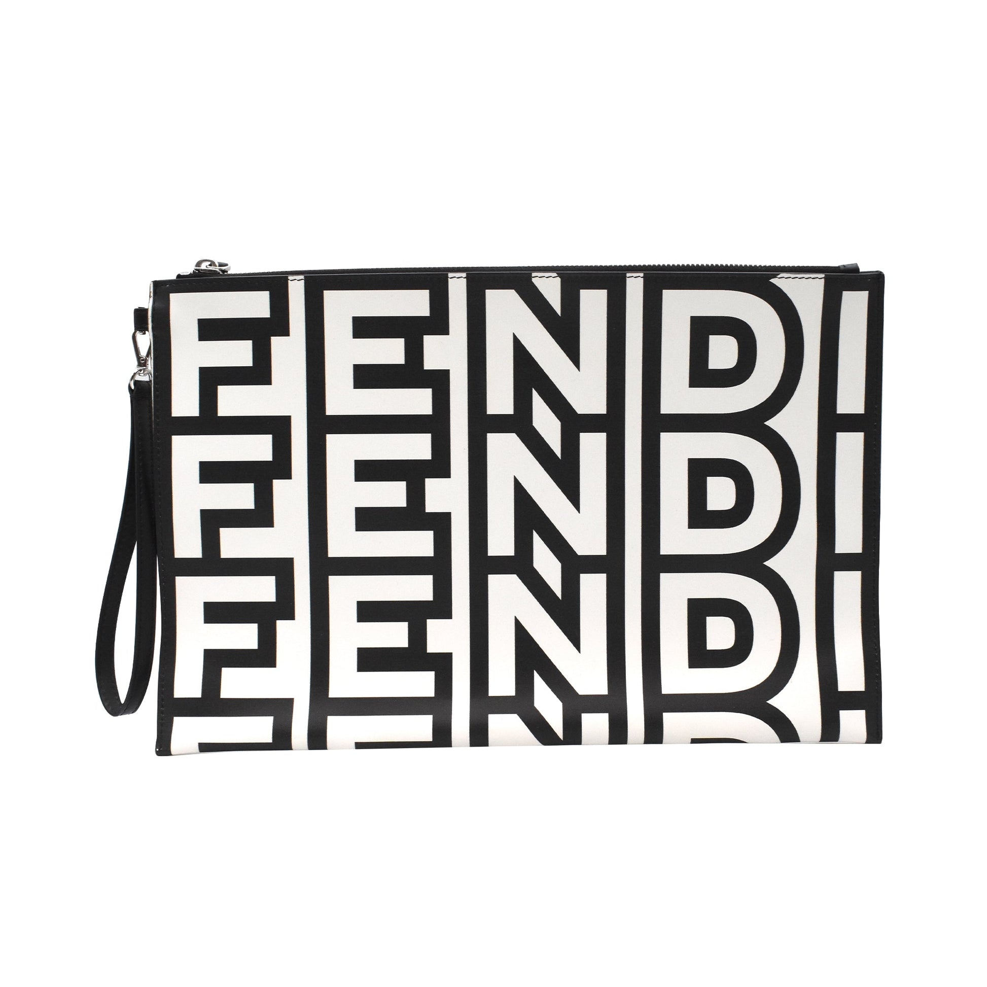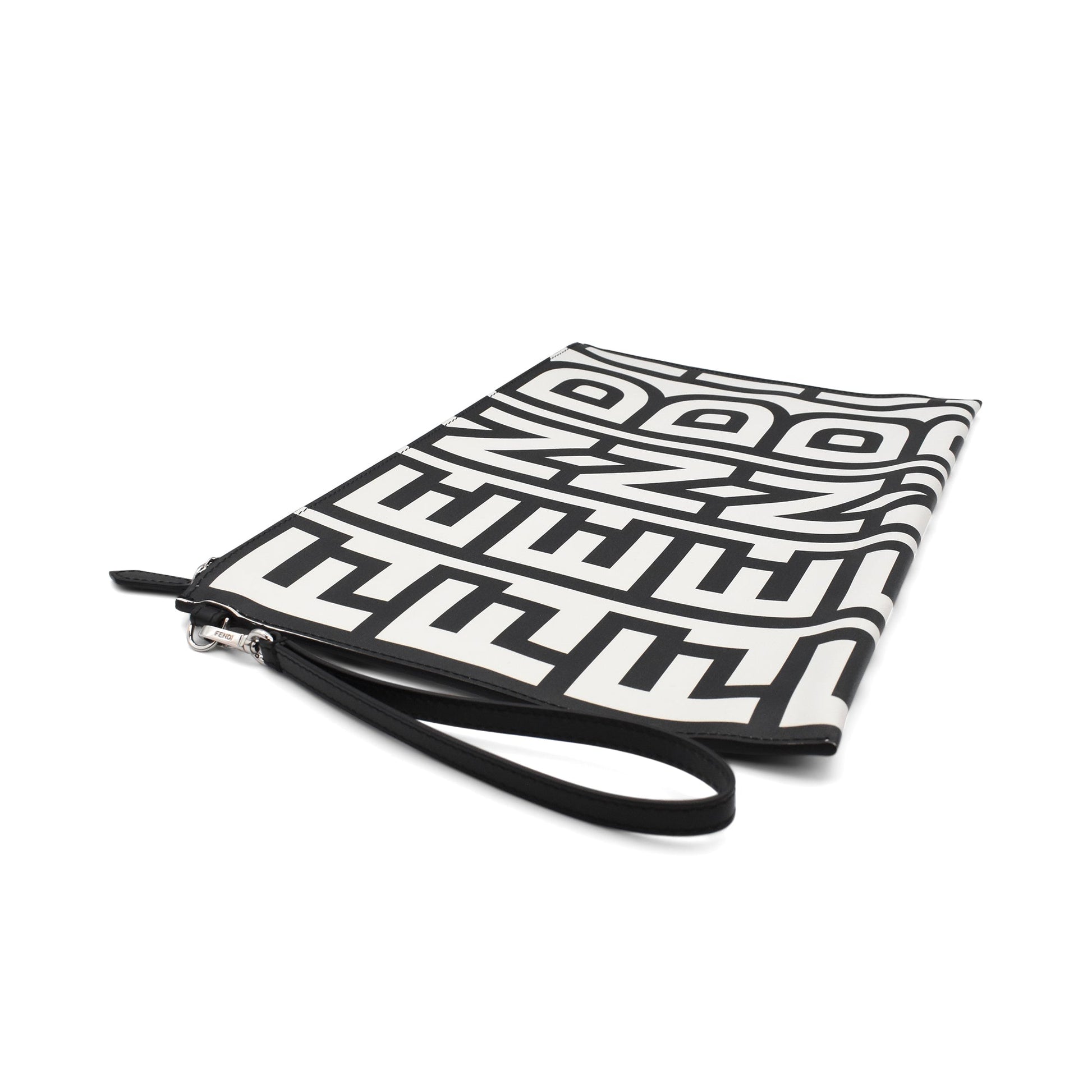 Fendi x Marc Jacobs 'King Logo' clutch with an all-over white and black logo graphic, removable wrist strap, and a top zip opening in silver hardware.