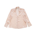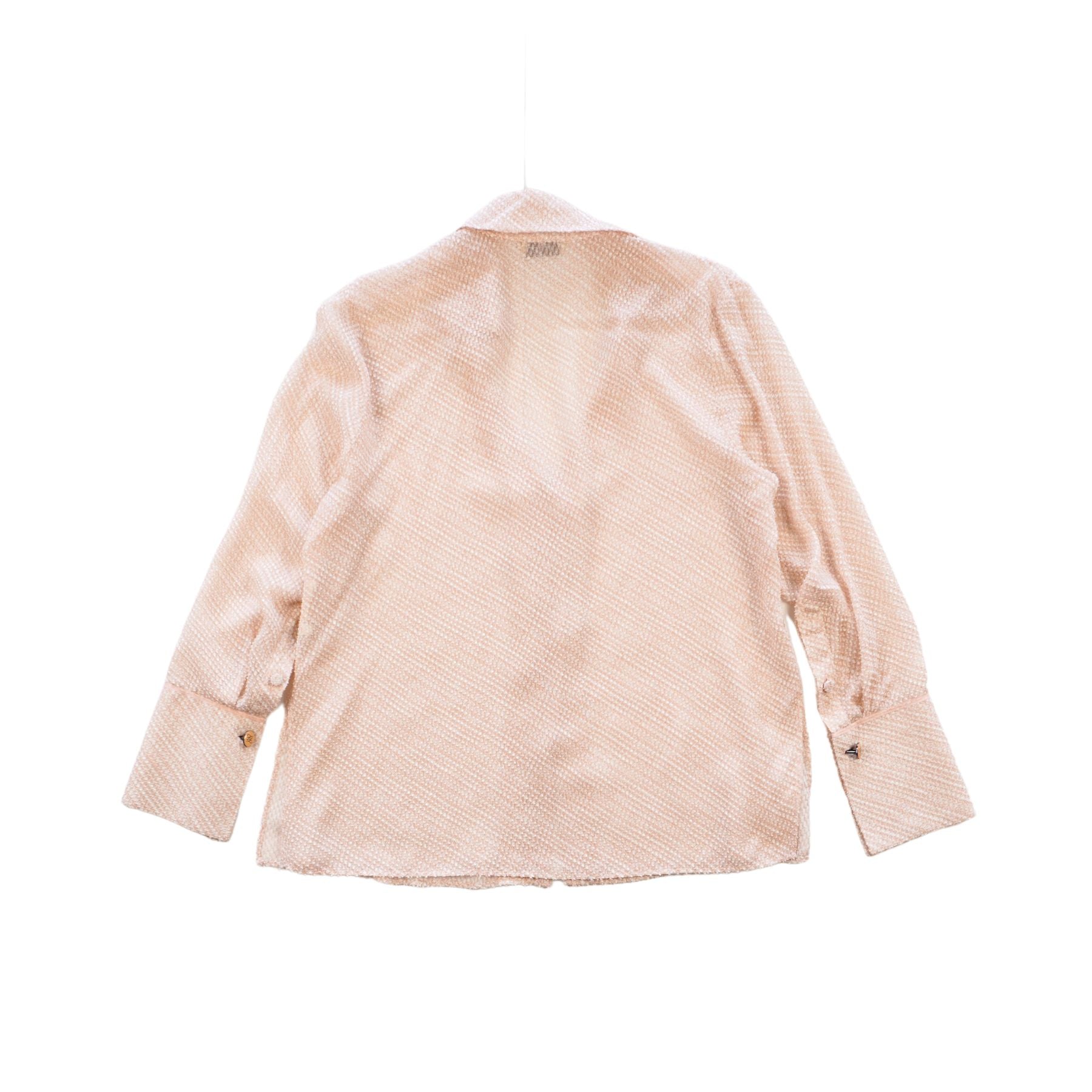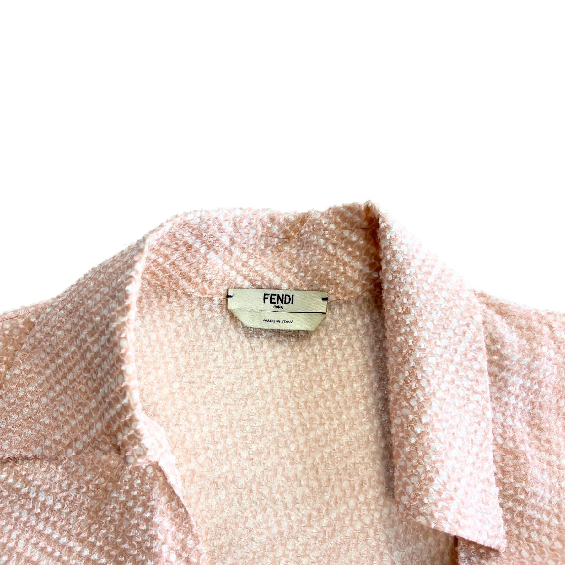 Fendi blouse top in light pink semi-sheer textured silk with an all-over subtle white dot print, a deep v-neckline, cufflinks on the sleeves in gunmetal hardware, and front button closures with covered buttons.