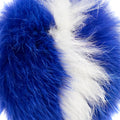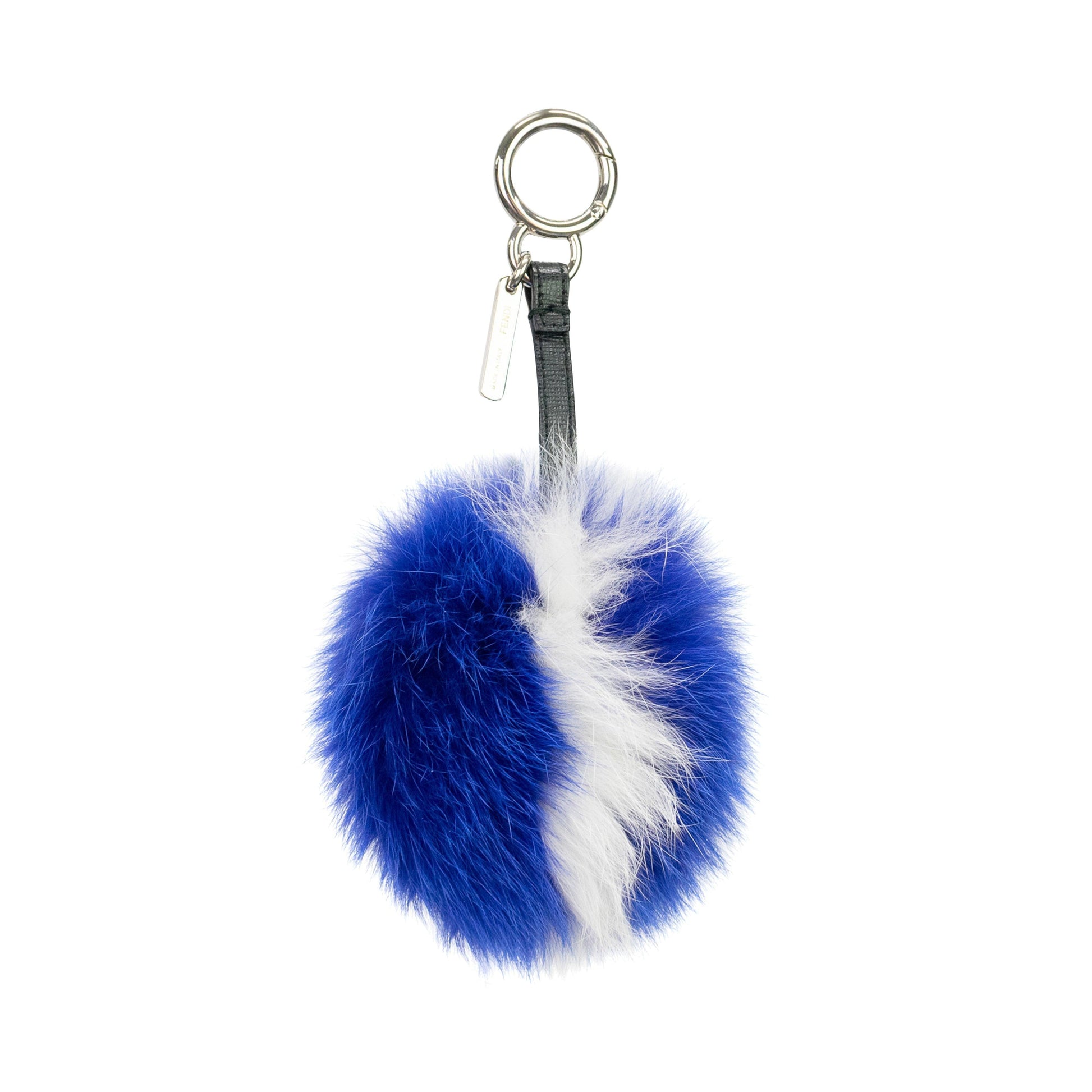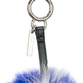 Fendi fur keychain in blue and white with a black leather strap and silver hardware.