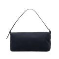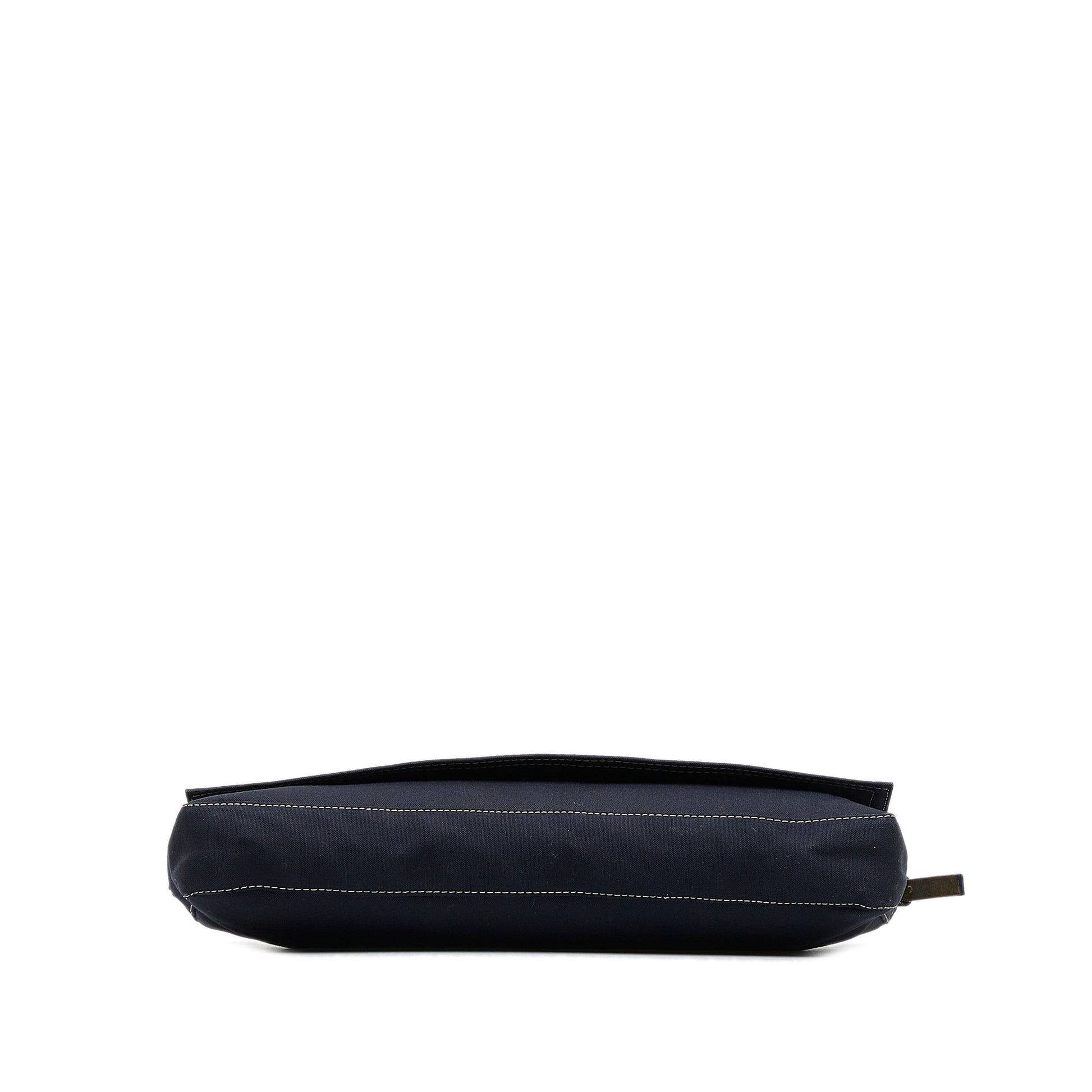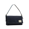 This baguette features a denim body, a flat leather strap, a front flap with magnetic closure, and an interior zip pocket.
