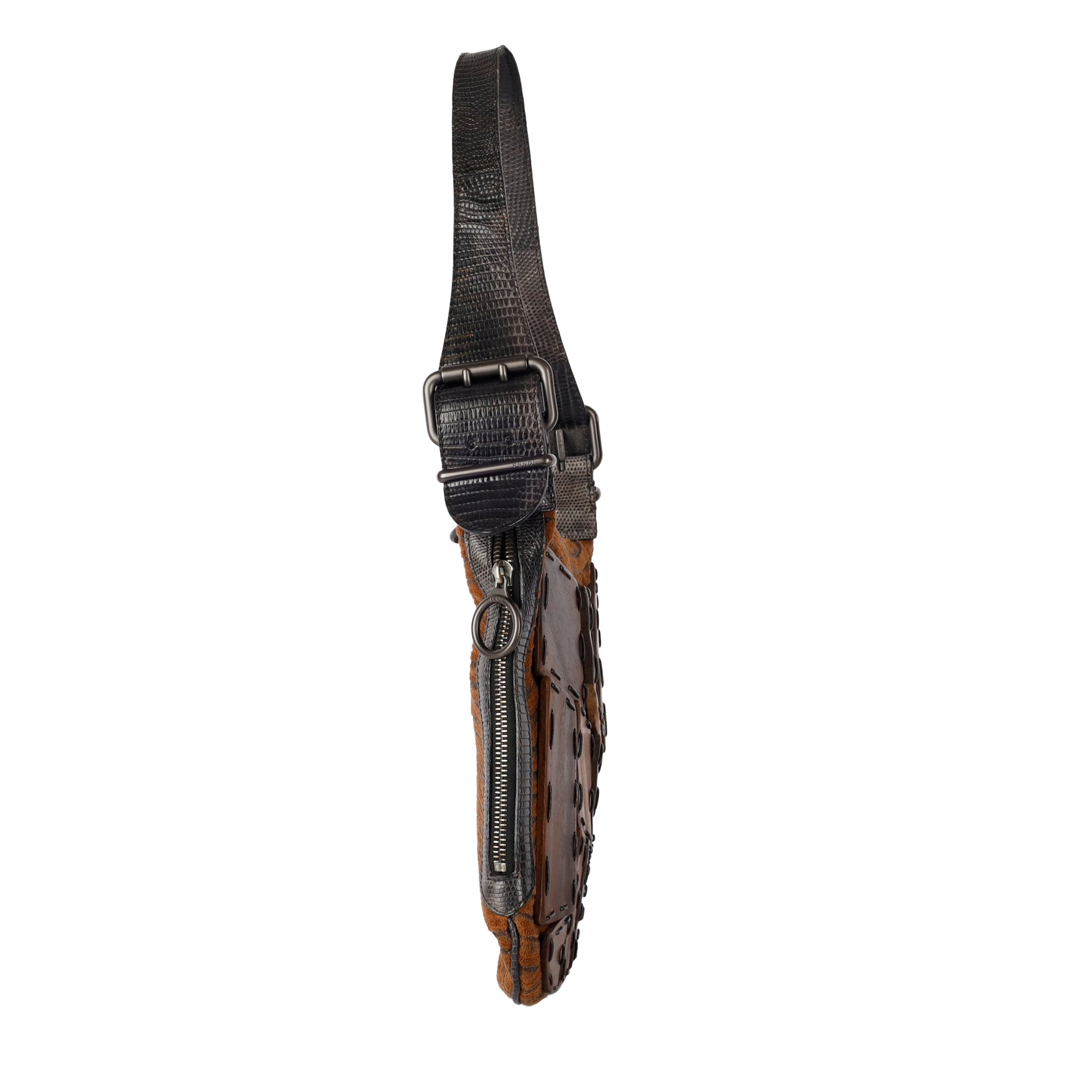 This Fendi Wood Paneled Oyster Hobo Bag offers a unique combination of wood panelling, suede fabric with animal print and lizard skin leather shoulder strap.