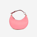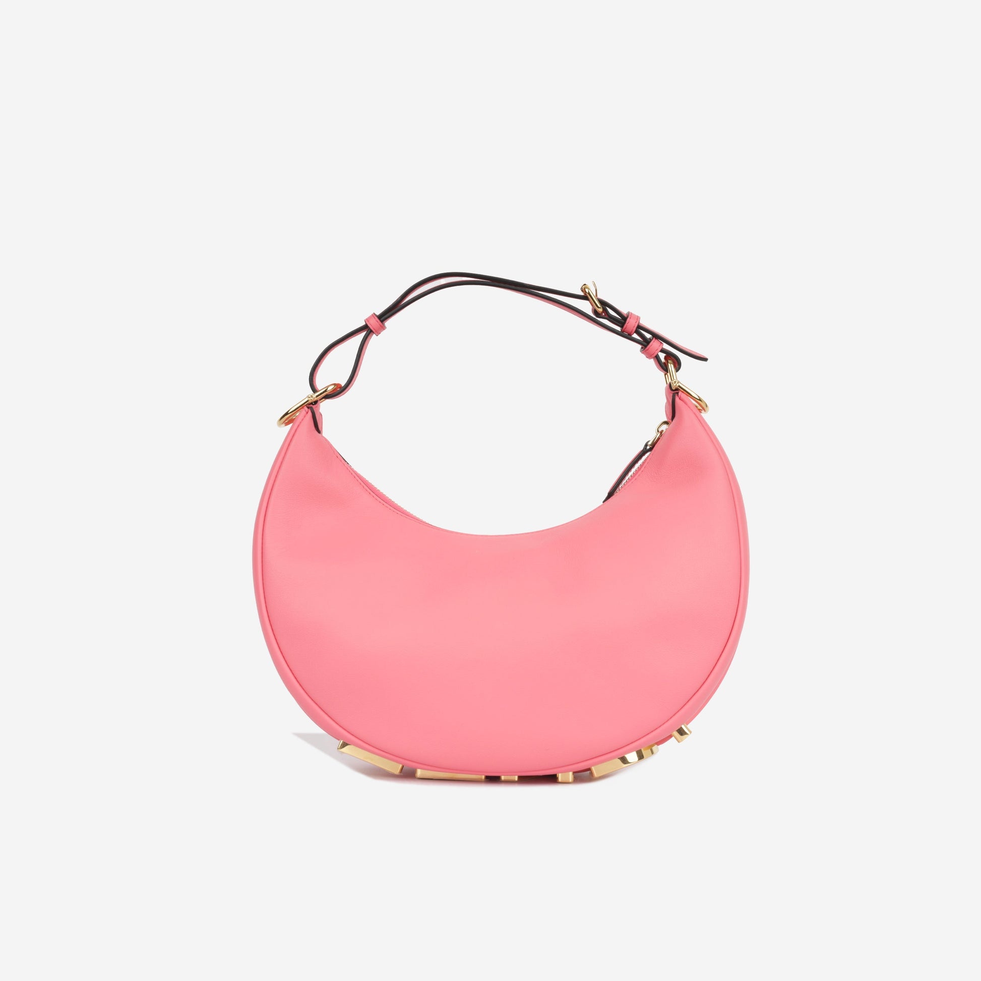 The Fendigraphy small hobo crafted from smooth pink calfskin and embellished with gold FENDI lettering across the base visible when worn on the shoulder. The adjustable shoulder strap allows for crossbody wear.