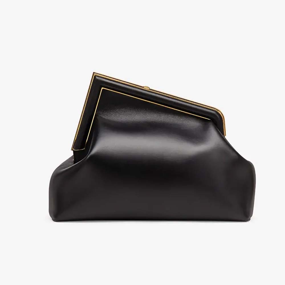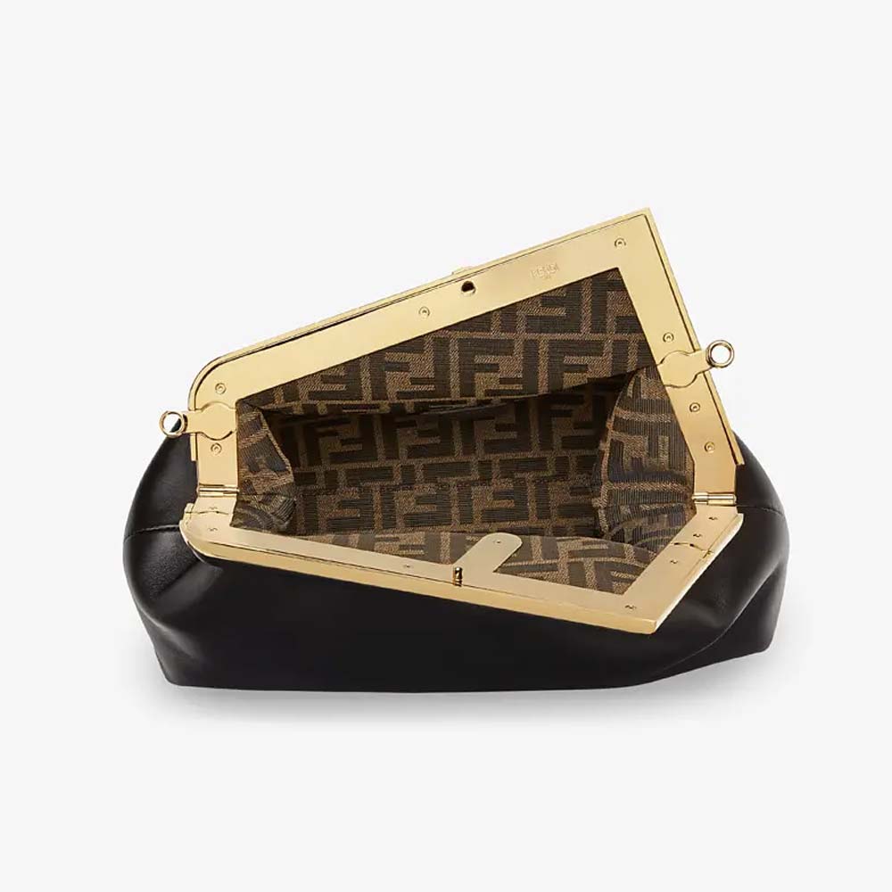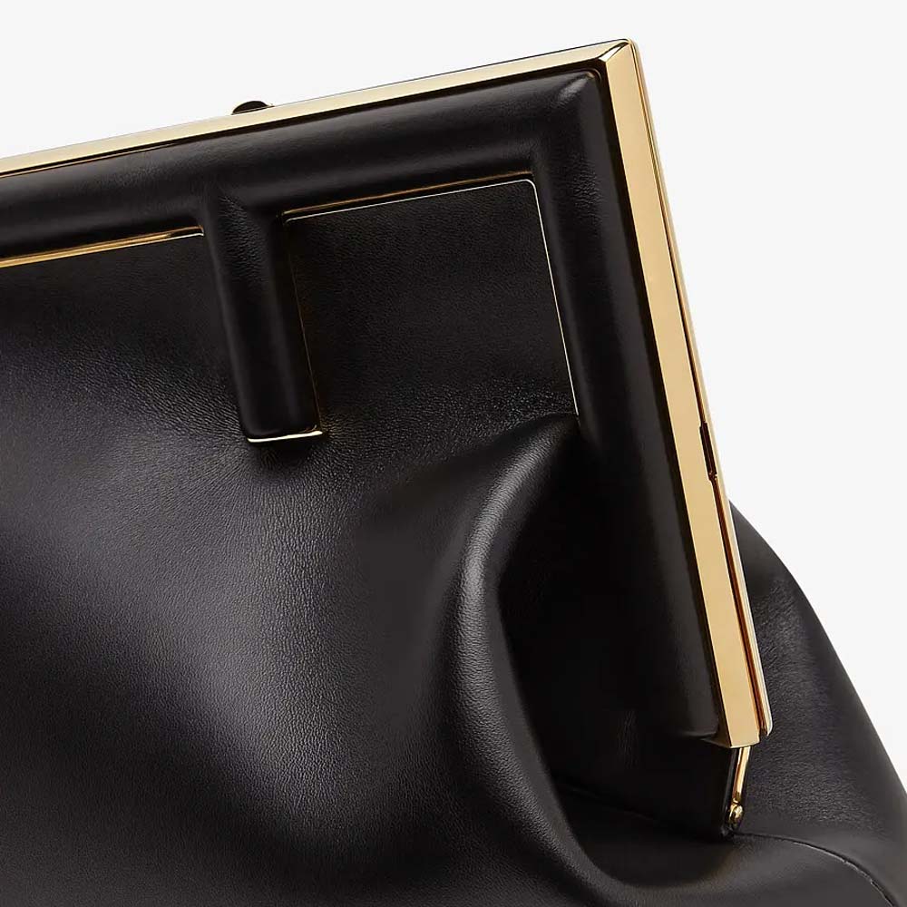 Medium Fendi First bag made of soft, black nappa leather with oversized metal F clasp bound in tone on tone nappa leather.