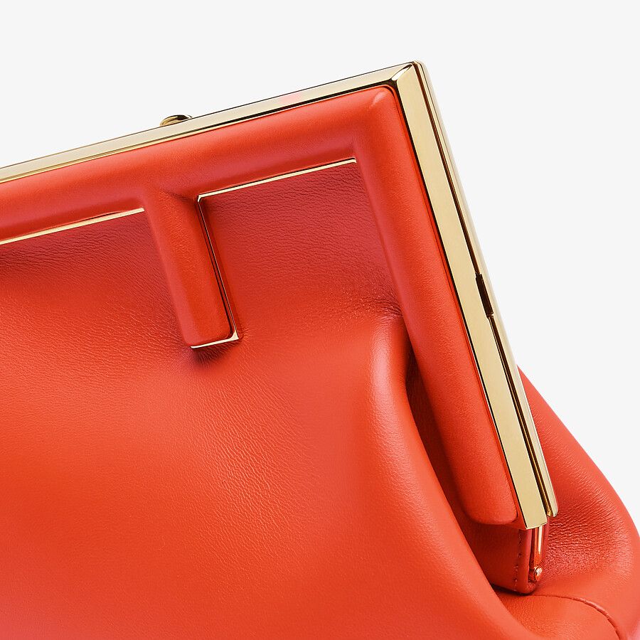 Small Fendi First bag made of soft, red nappa leather with oversized metal F clasp bound in tone on tone nappa leather.