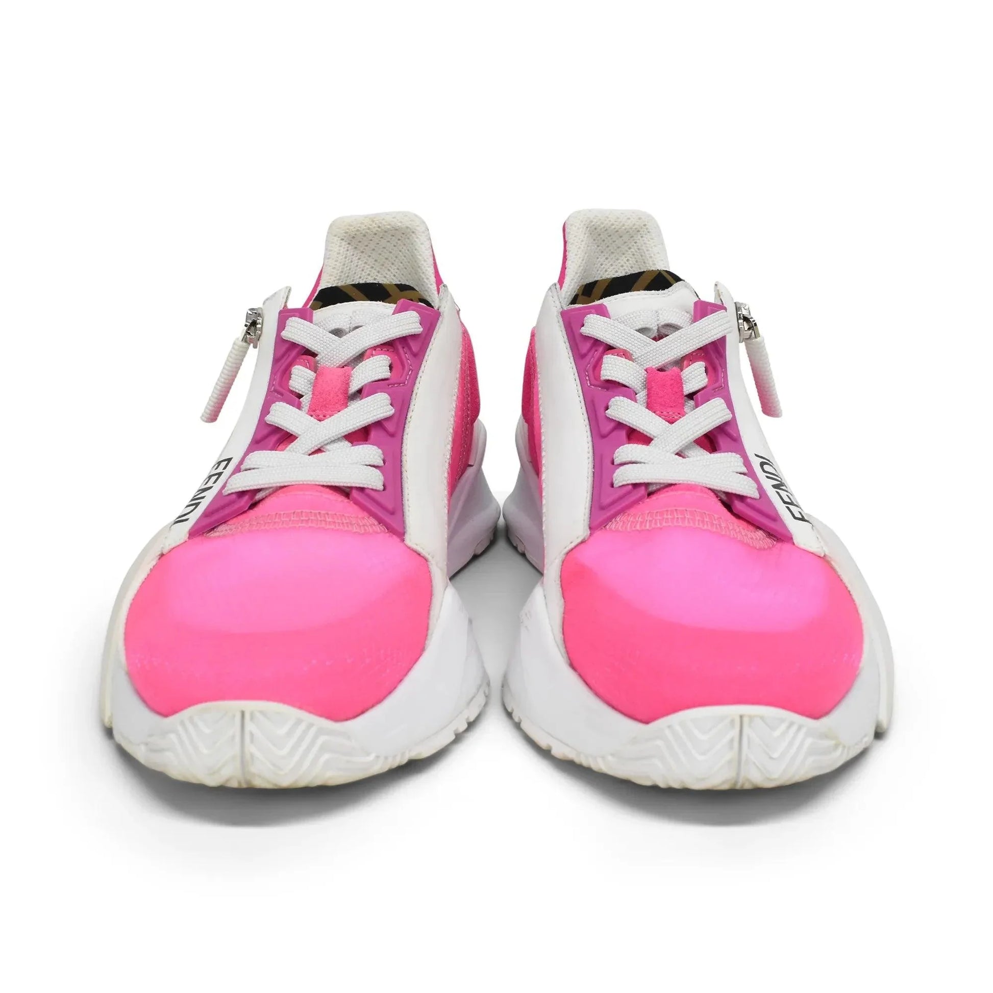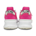 Fendi 'Flow' sneakers in bright pink with a white sole and white detailing throughout. Features a zipper on the outer sides in white with black logo, pink plastic lace eyelets, suede and neoprene panel details, a black and white rubber heel tab with 'Flow' on the back, and brown and black logo monogram trim on the tongue.