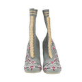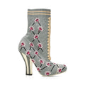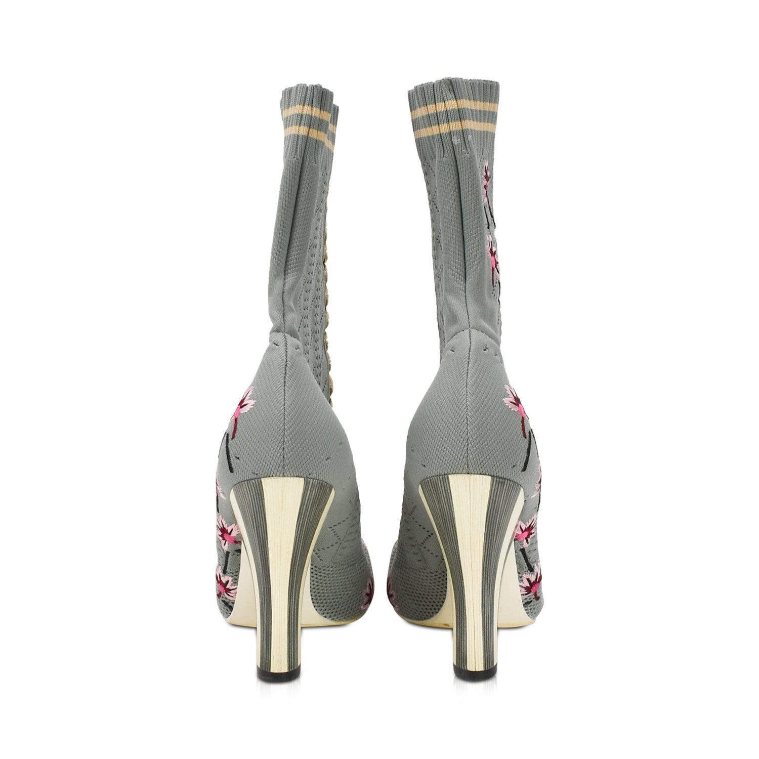 Fendi stretch sock boot in grey with flower embroidered pattern throughout, thick lace-up, and a striped heel.