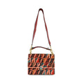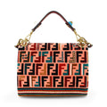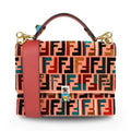 Fendi 'Kan I' hand bag in 'Vitello Dolce Fun Fair' strawberry pink and multicolour velour colour way. Features an interchangeable short and long red leather straps with square studs, and a white, blue, silver, and gold stud push-lock top flap closure. The accordion-style black leather lined interior features two compartments and a small slip pocket.