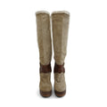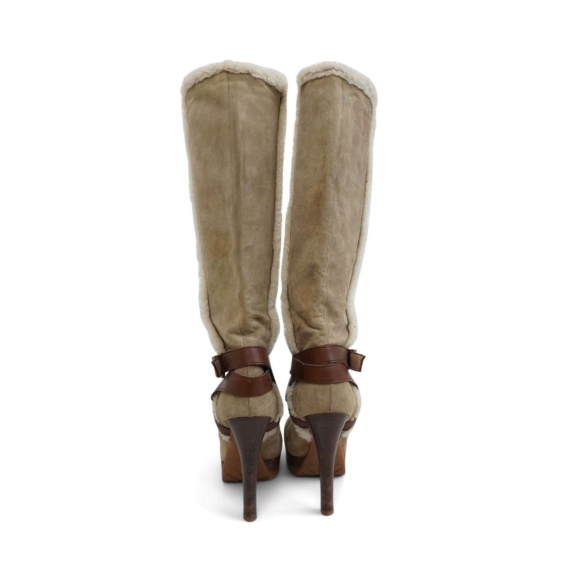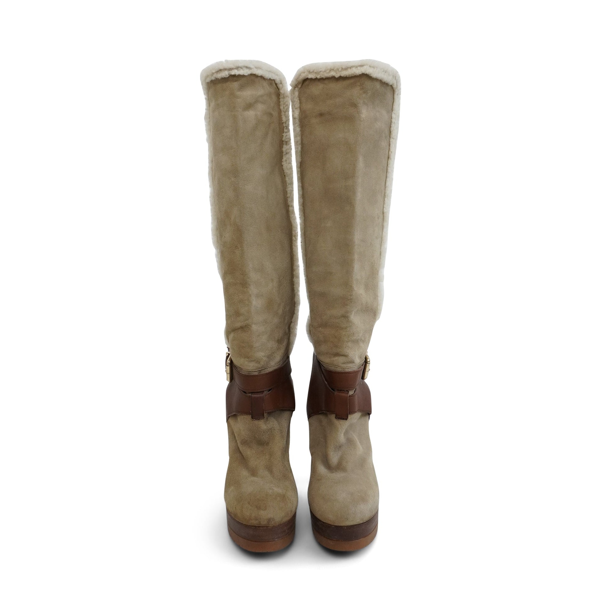 Fendi knee-high boots in beige suede with a shearling trim, brown leather trim around the ankles with soft gold buckle hardware, and a stacked wooden heel with a platform sole.