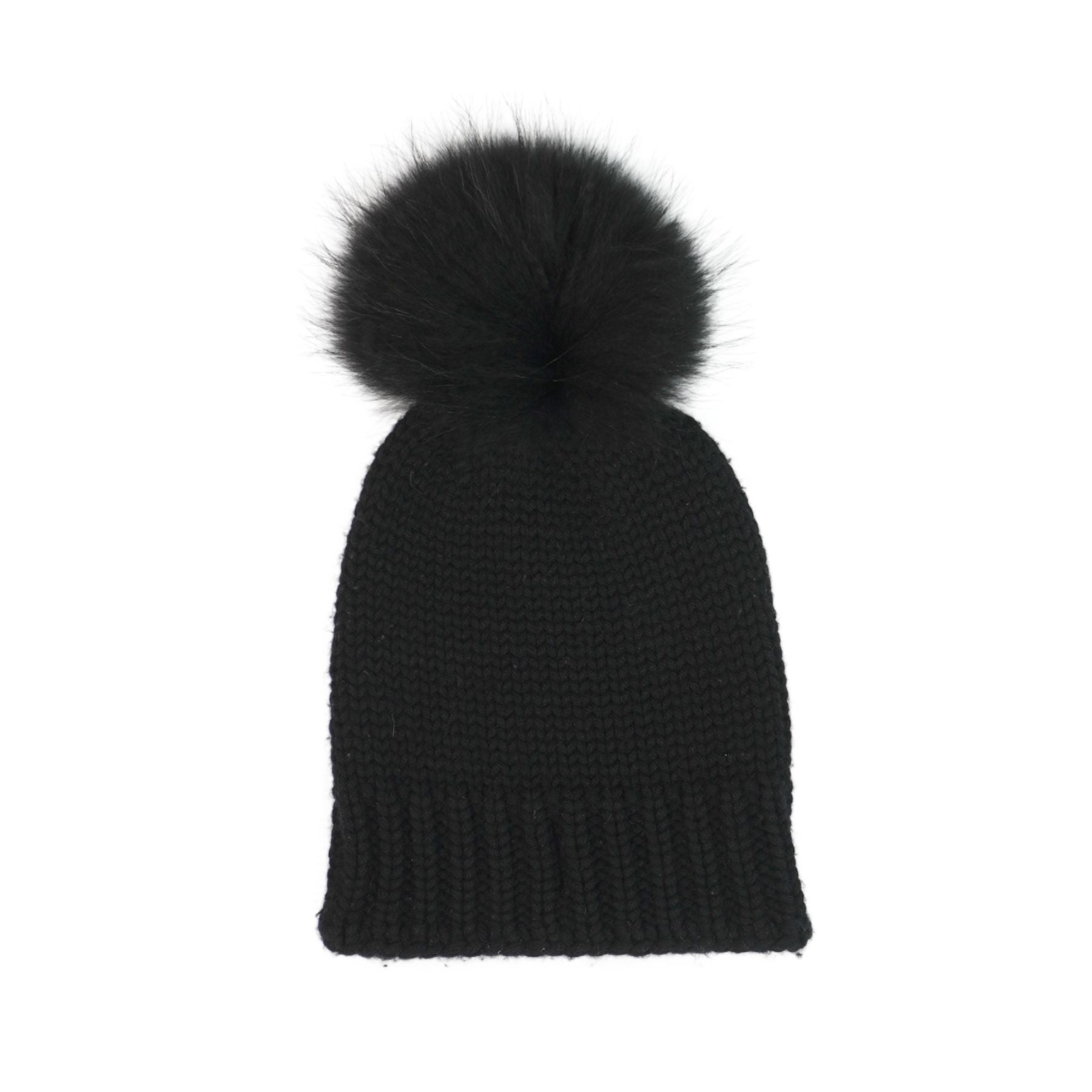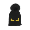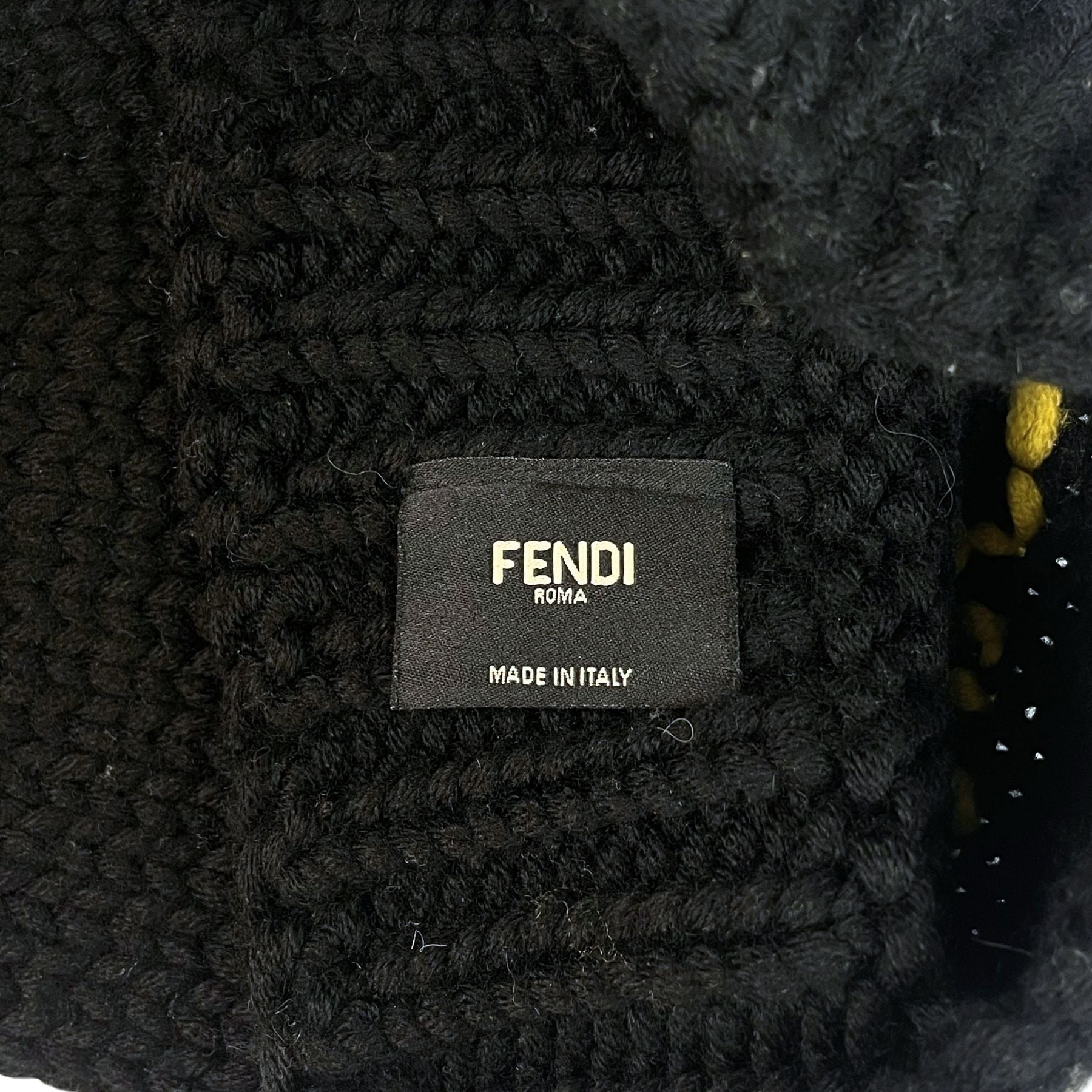 Fendi toque in black knit wool with signature yellow eye stitching and a large black fur pom-pom on the top.