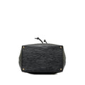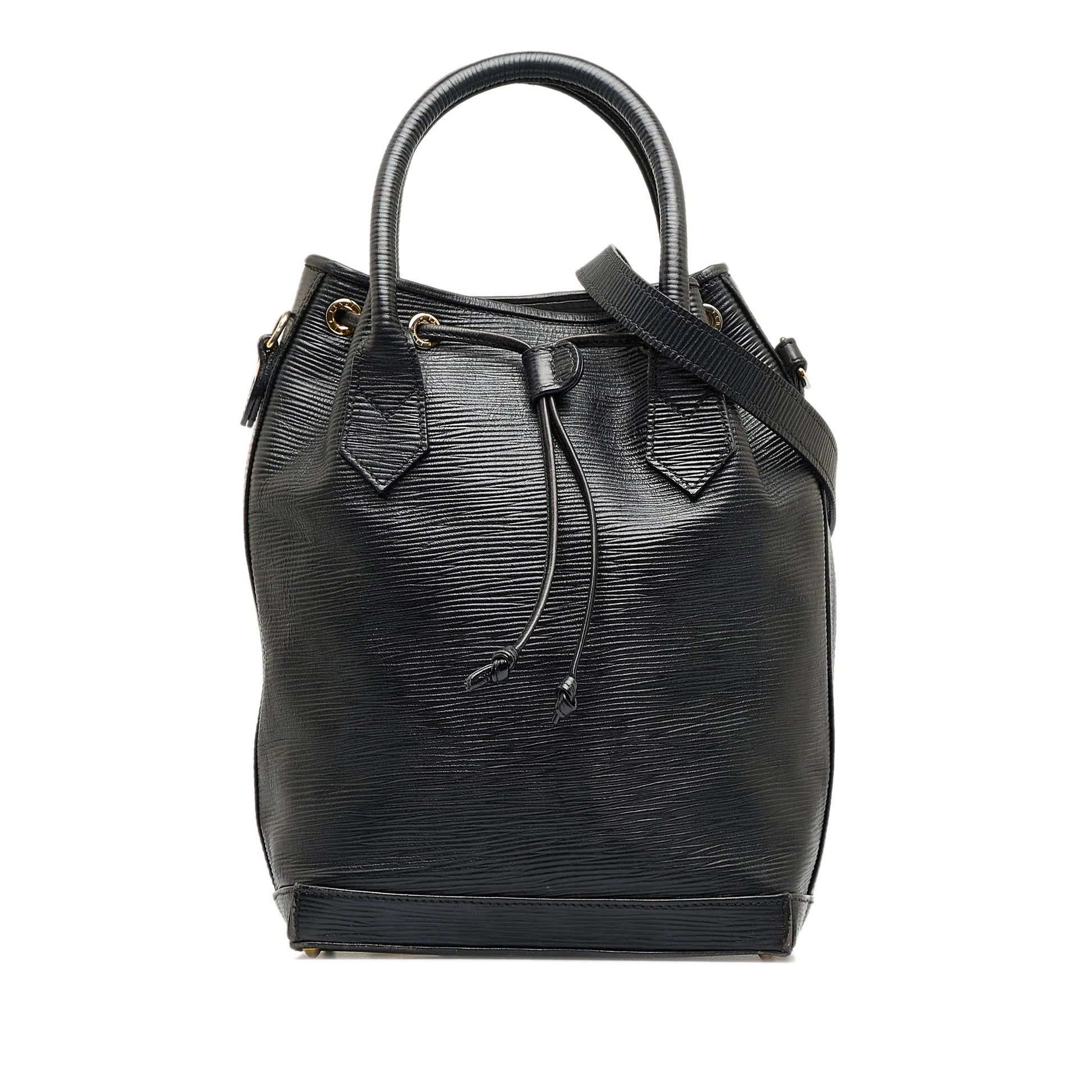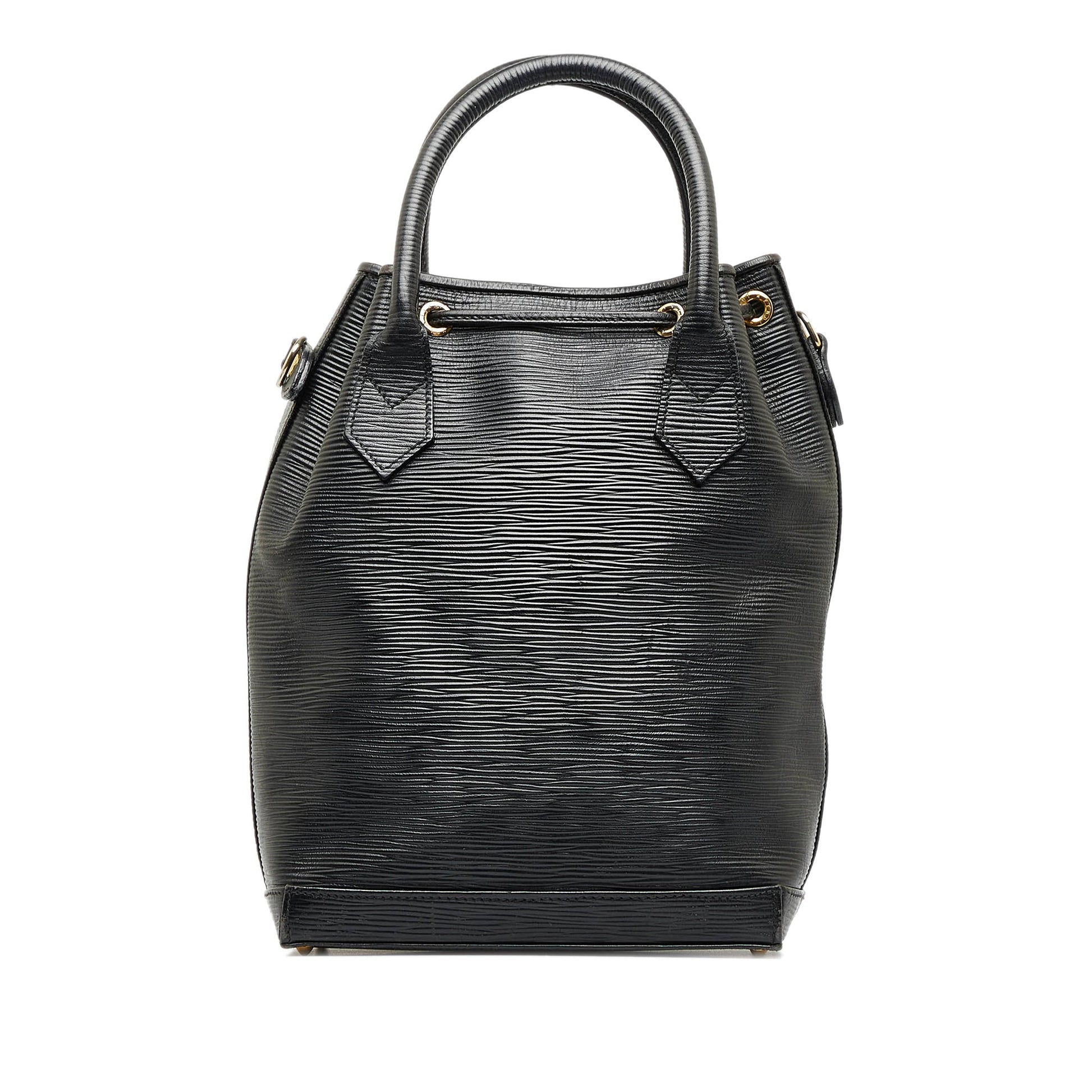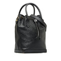 This satchel features a leather body, rolled leather handles, a detachable flat strap, an open top with drawstring closure, and an interior zip pocket.