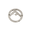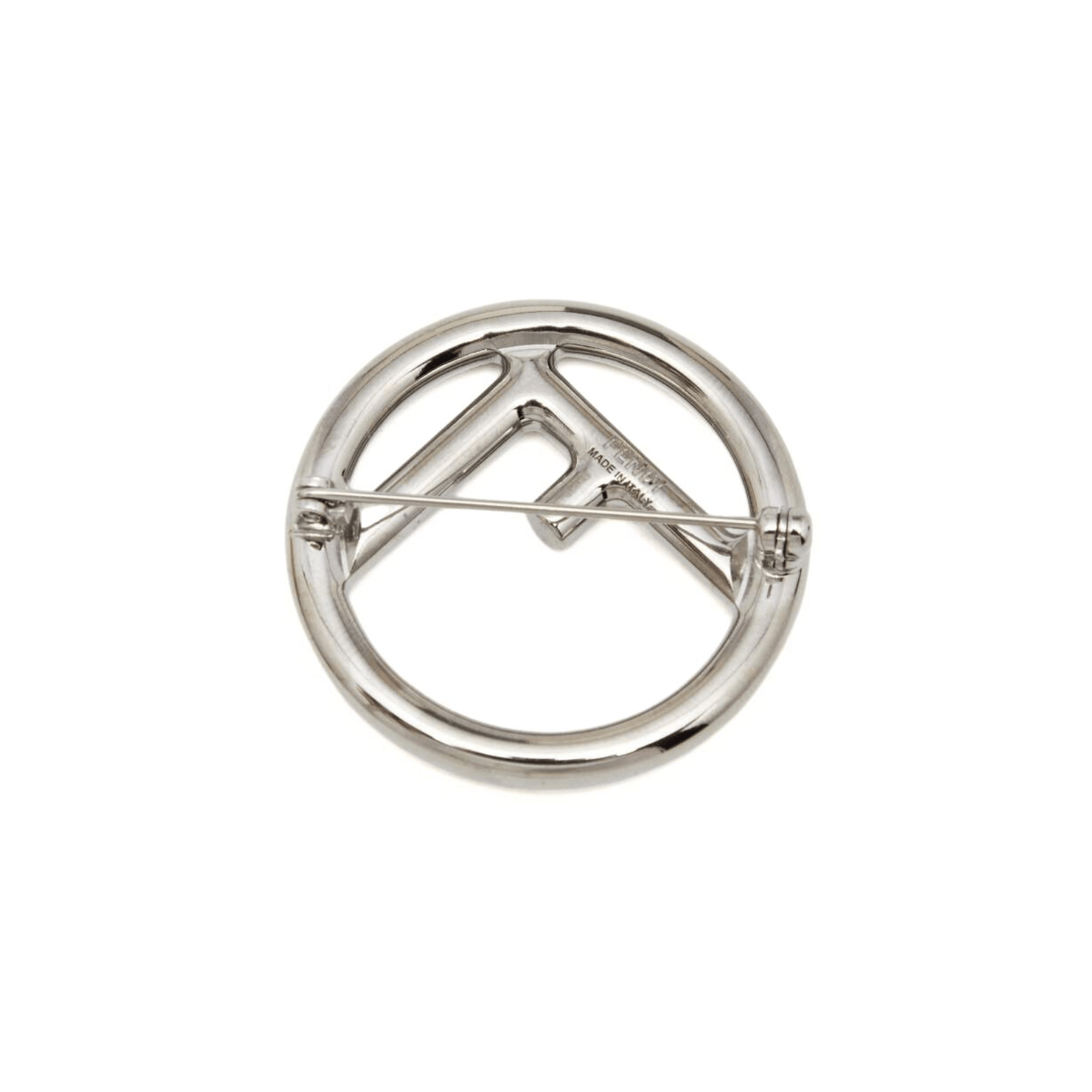 Fendi brooch in a circular shaped silver metal with an 'F' logo cutout.