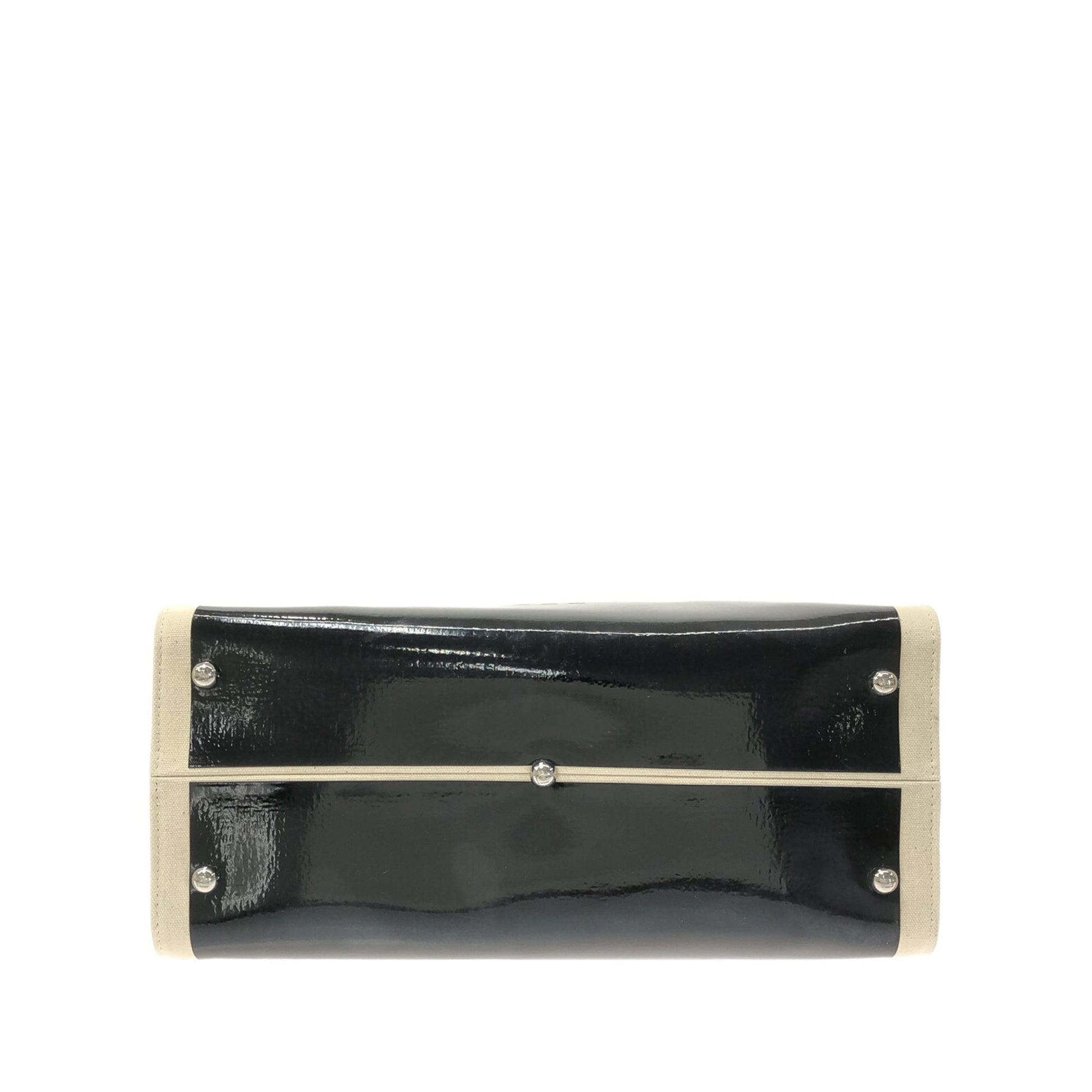 The Sunshine Shopper tote features a patent leather body, rolled handles, a detachable flat shoulder strap, and an open top. Comes with dust bag