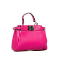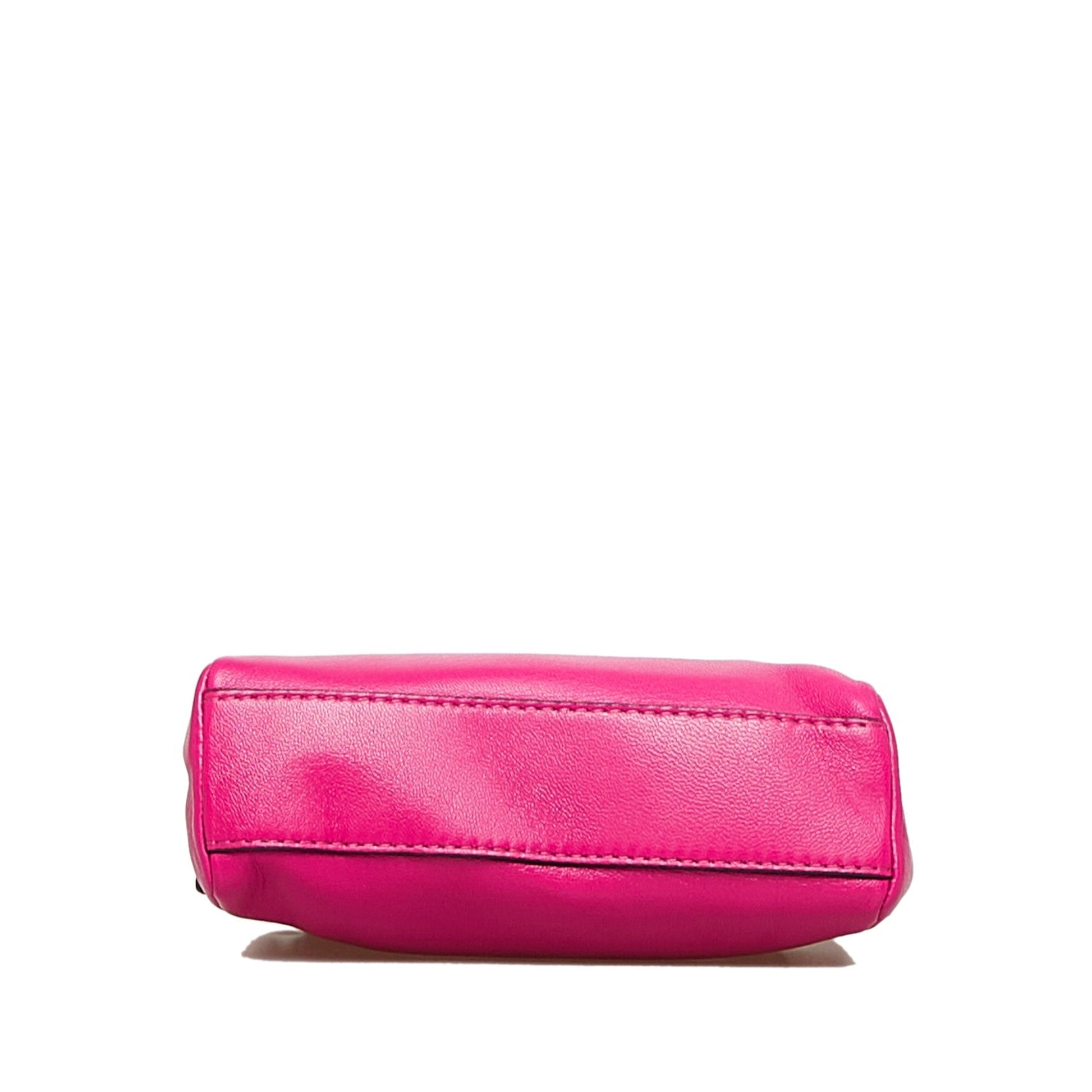 The Micro Peekaboo features a leather body, a flat leather handle, a detachable strap, a twist lock closure, and an interior slip pocket. Comes with dust bag