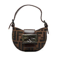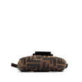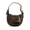 This baguette features a canvas body, a flat leather handle, a front flap with magnetic snap closure, and an interior zip pocket.