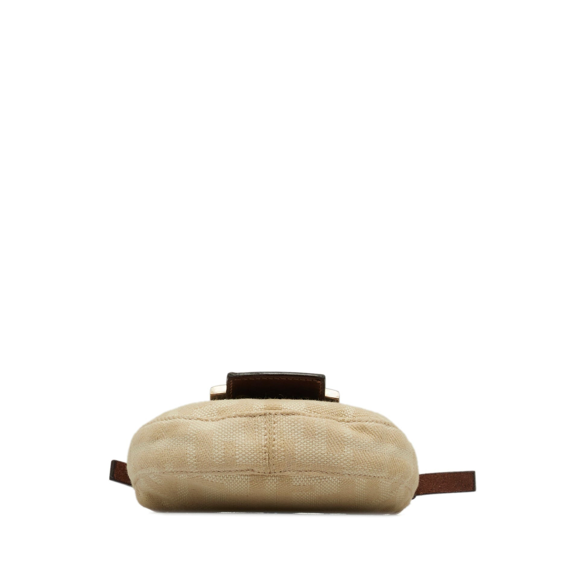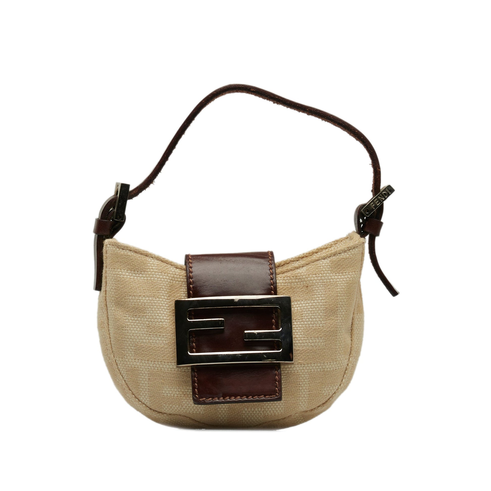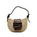 This baguette features a canvas body, a flat leather handle, a front flap with magnetic snap closure, and an interior zip pocket. Comes with dust bag
