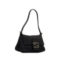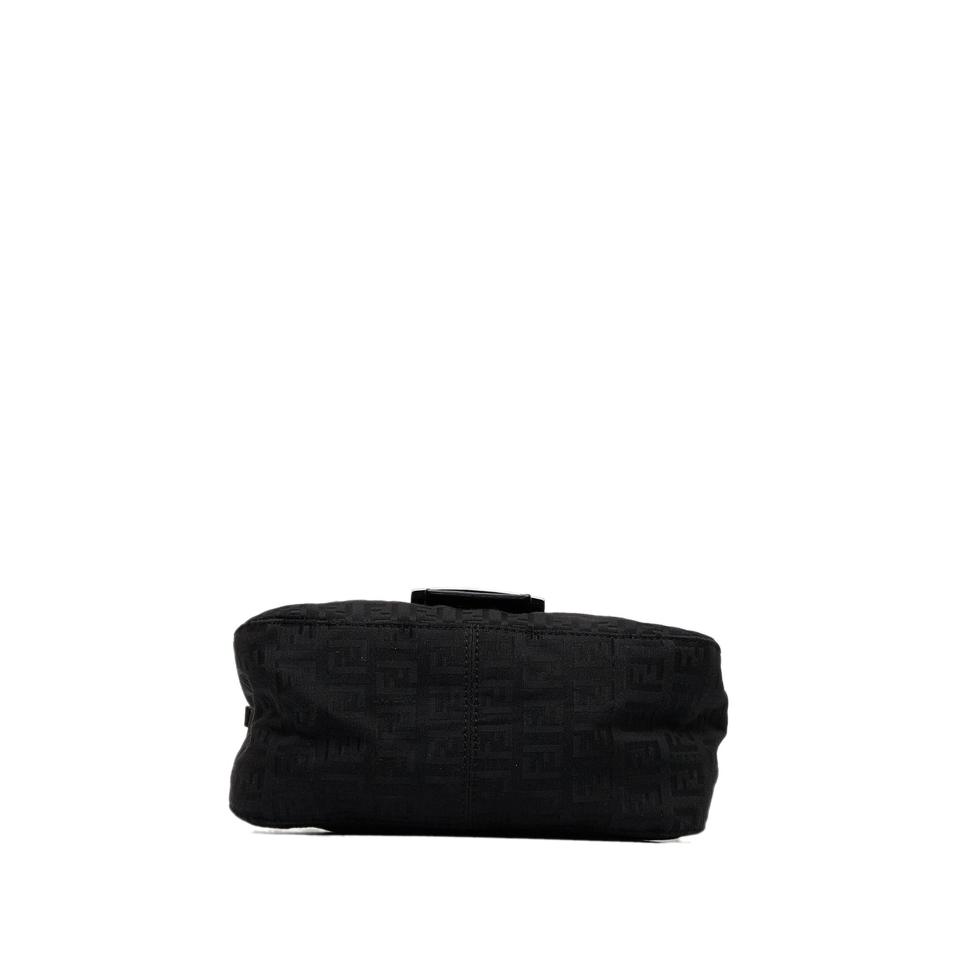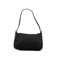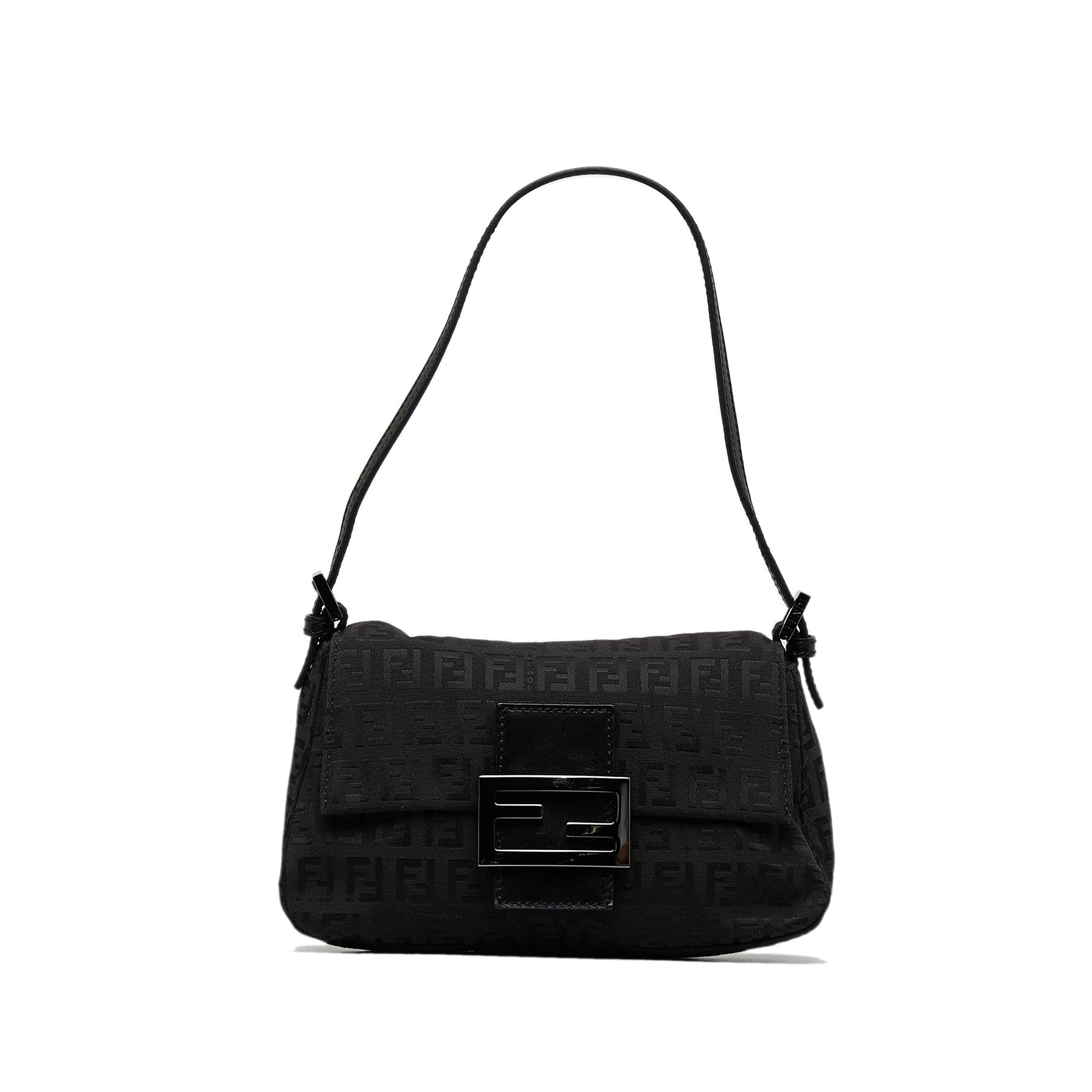 This baguette features a canvas body, a flat leather strap, a front flap with a flat strap and magnetic snap closure, and an interior zip pocket.