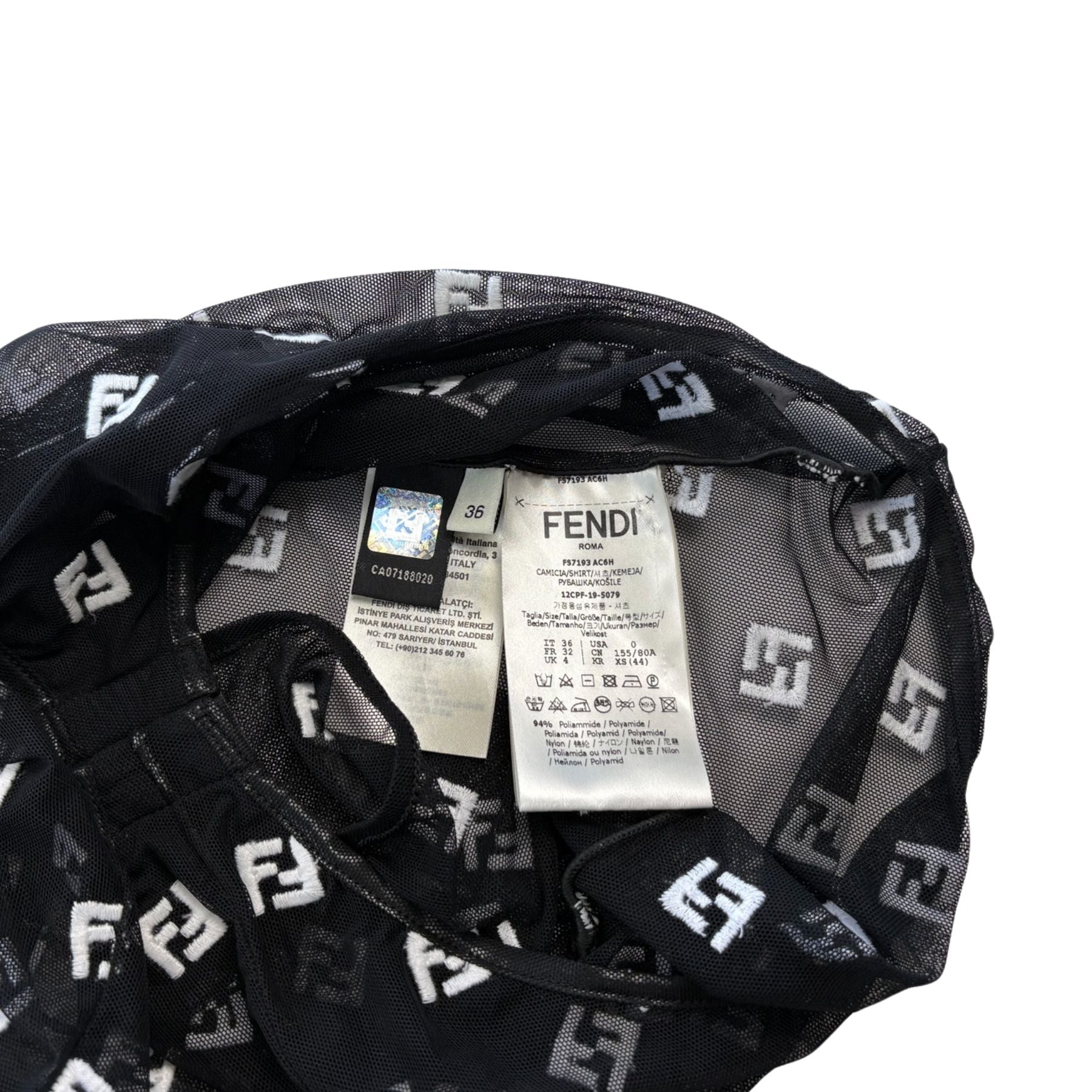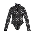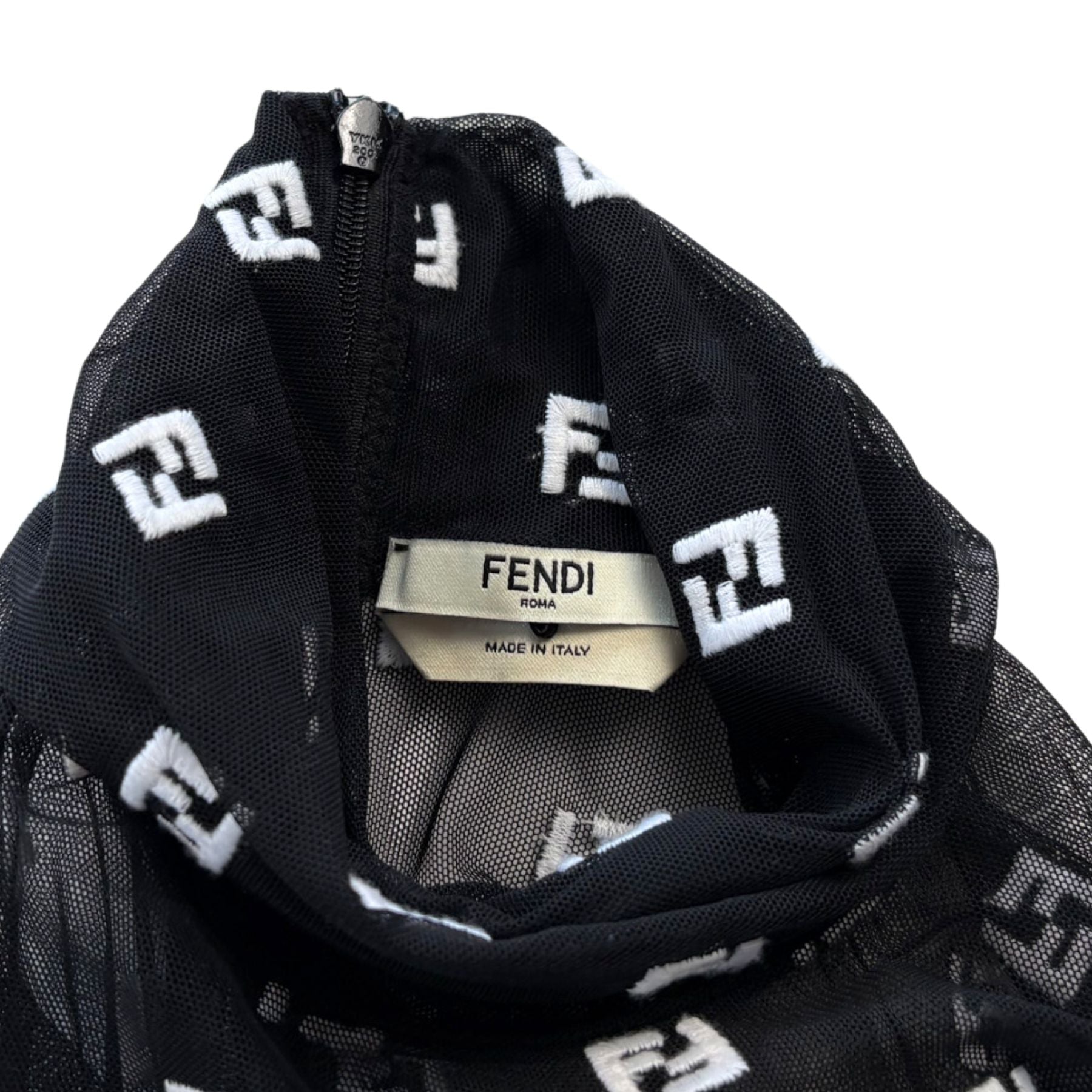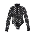 Fendi body suit in black mesh with white embroidered 'FF Zucca' monogram overlay, a mock neckline, and a thong-cut bottom with an adjustable hook and eye gusset.