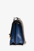 Fendi Navy Leather Small Kan Shoulder Bag. Front fold-over flap with push tab closure. 2 open interior compartments. 1 wall interior slip pocket. Tonal stitching.