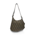 Fendi 'Oyster' bag in brown and black FF monogram canvas with top zip closure in silver hardware, a side zip pocket, and an adjustable brown leather strap with silver buckles.