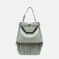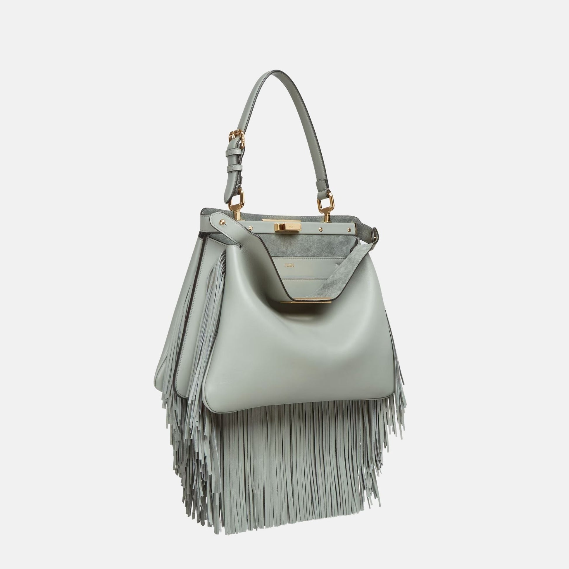 The Fendi Peekaboo Soft Medium Bag is a masterpiece of Italian craftsmanship and timeless elegance, redefining luxury with its iconic silhouette and innovative design. First introduced in 2009, the Peekaboo bag plays on the contrast between exterior beauty and interior functionality, just like the children’s game it is named after. The Fall Winter 2024/25 fashion show introduced this softer, more fluid interpretation, enhancing the bag’s signature smile-like opening on the front panel. Crafted from silky matcha green calfskin, this version is further distinguished by 20 cm long fringes along the center partition, adding a unique, textural dimension.
