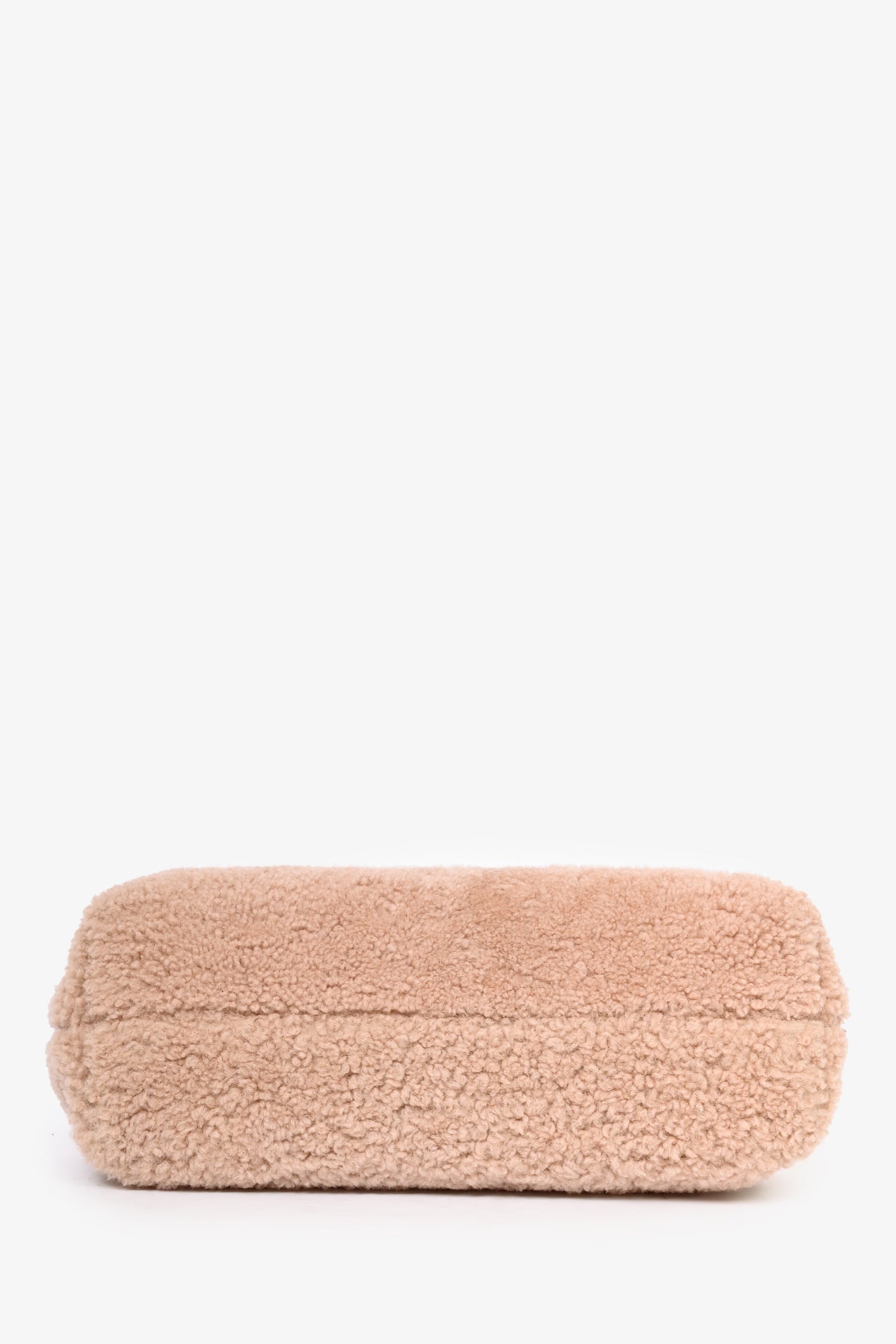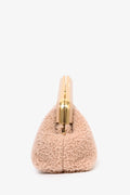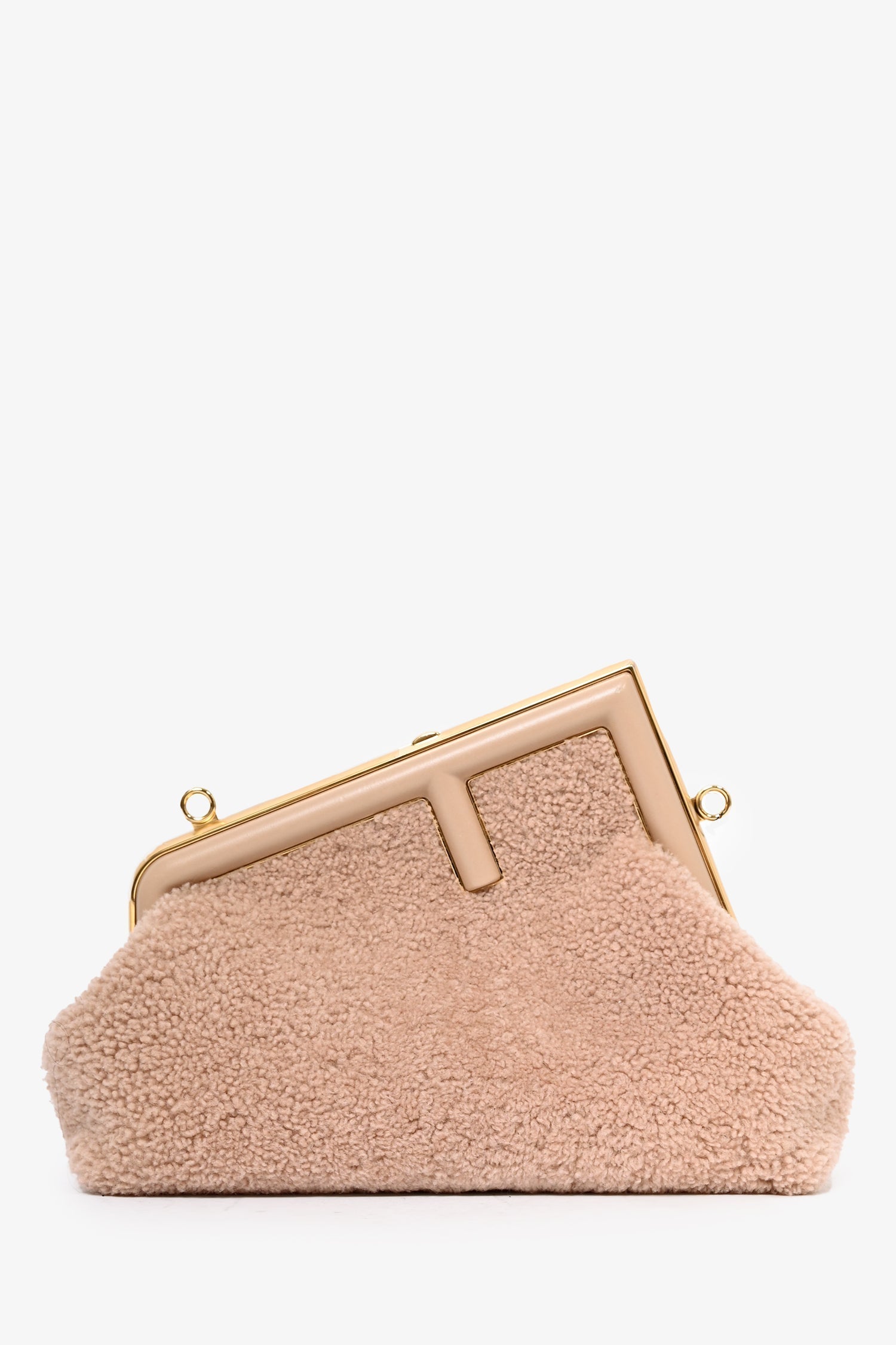 Fendi Pink Shearling Small First Clutch. Gold-tone push open closure. Shearling outer. Tonal stitching. Leather trimming. Canvas 'Zucca' motif in interior. Attachable leather strap.