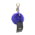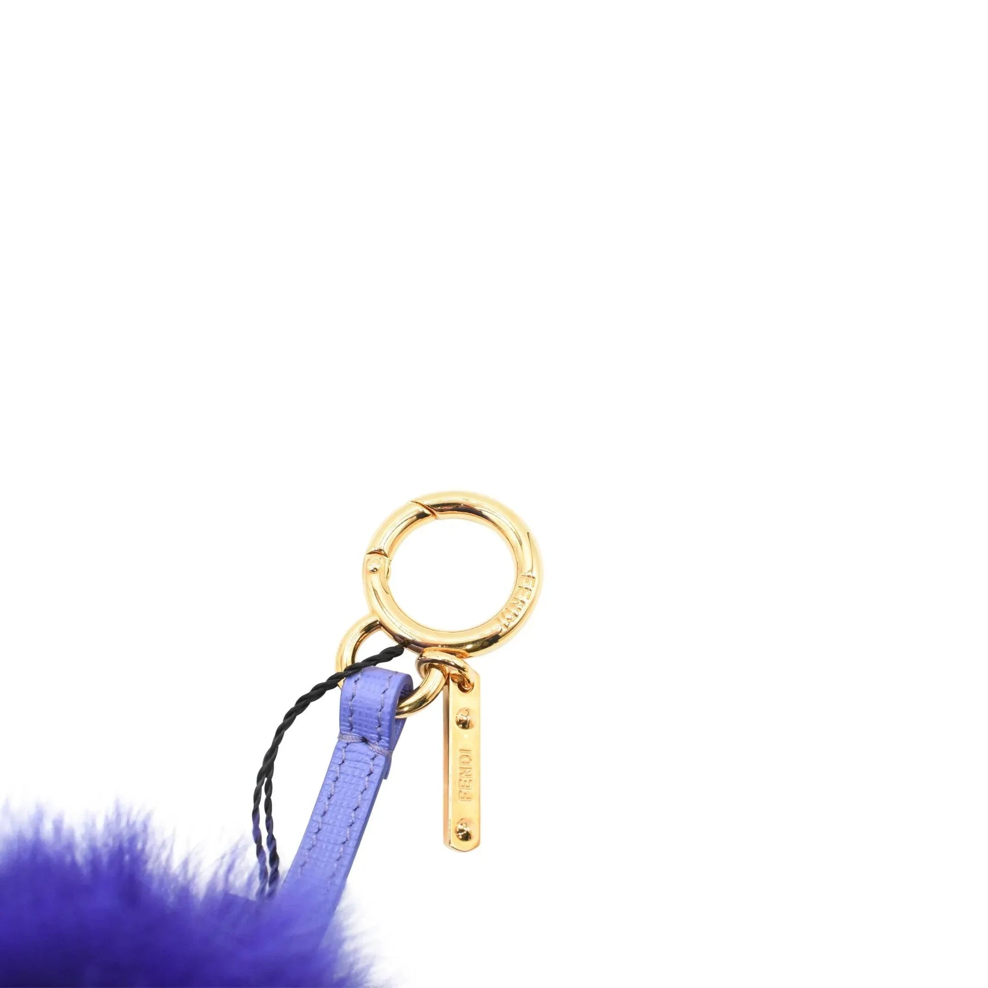 Fendi pom-pom bag charm in cobalt blue fox fur with a leather strap and gold clip.