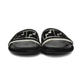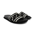 Fendi 'Fun Logo' pool slides in black and white leather with black felted 'FF' zucca graphics on the toe strap.