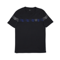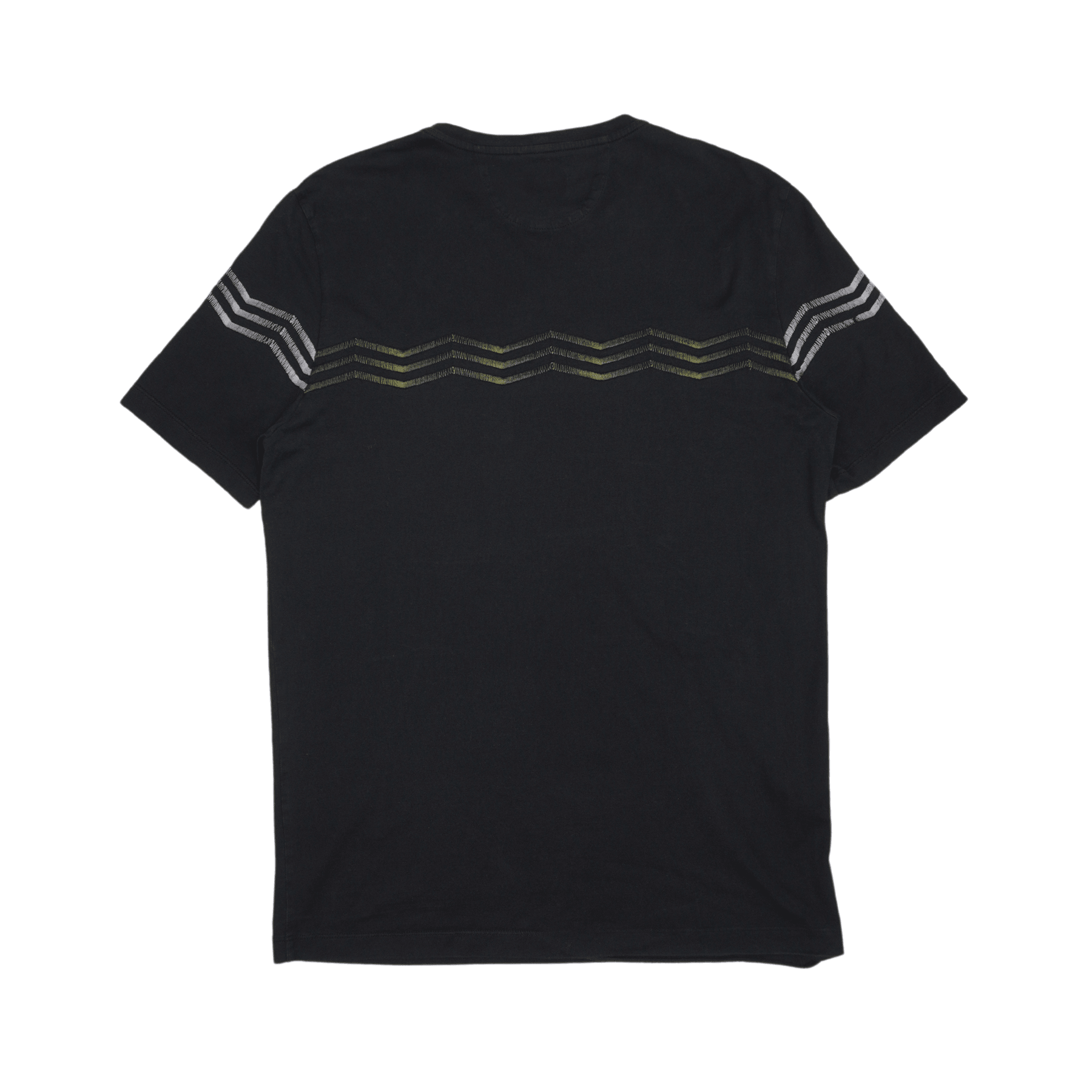 Fendi t-shirt in black cotton with grey, blue, and green zig-zag embroidered stitching. Features a black circle embroidered face on the chest and logo ribbon tab with button on the bottom.