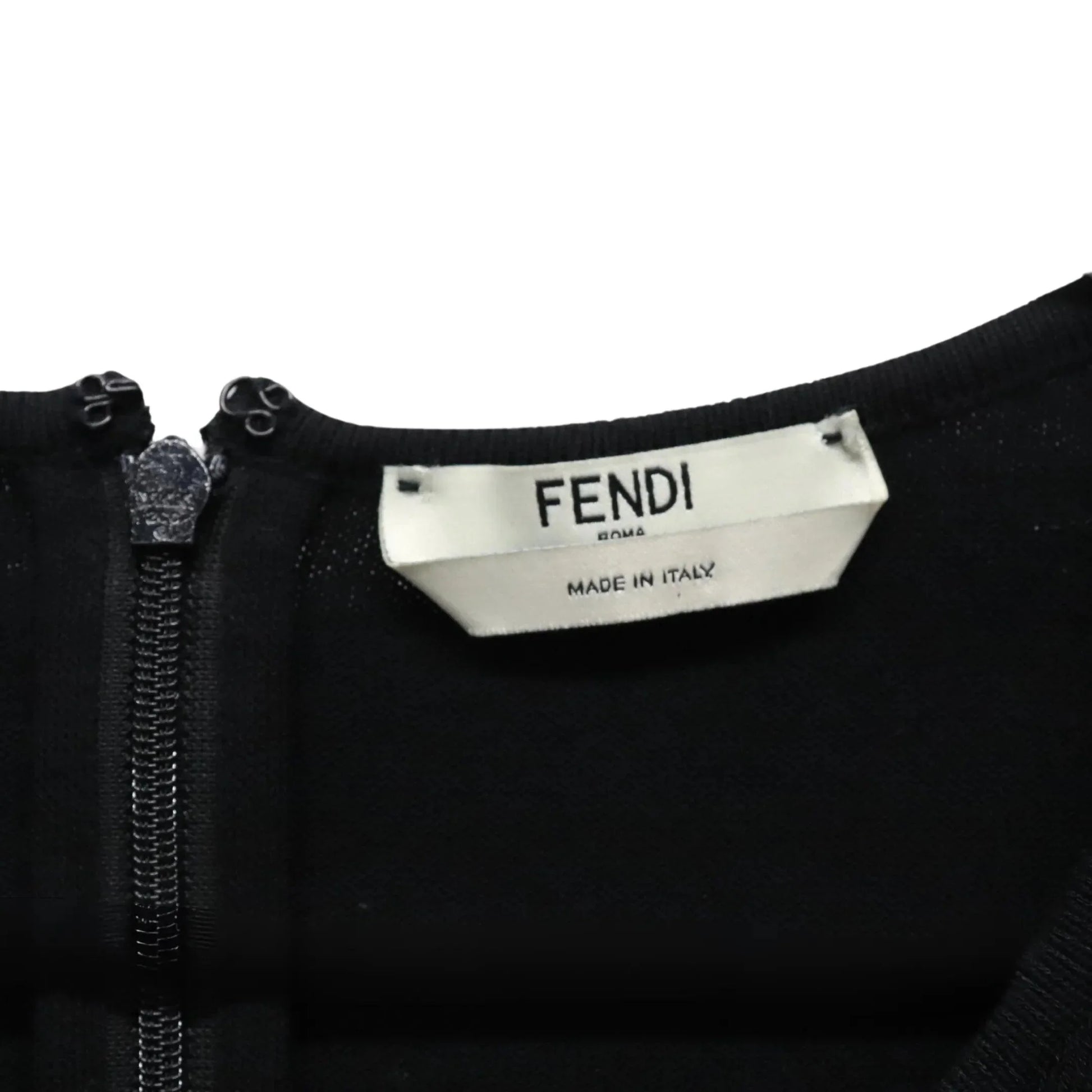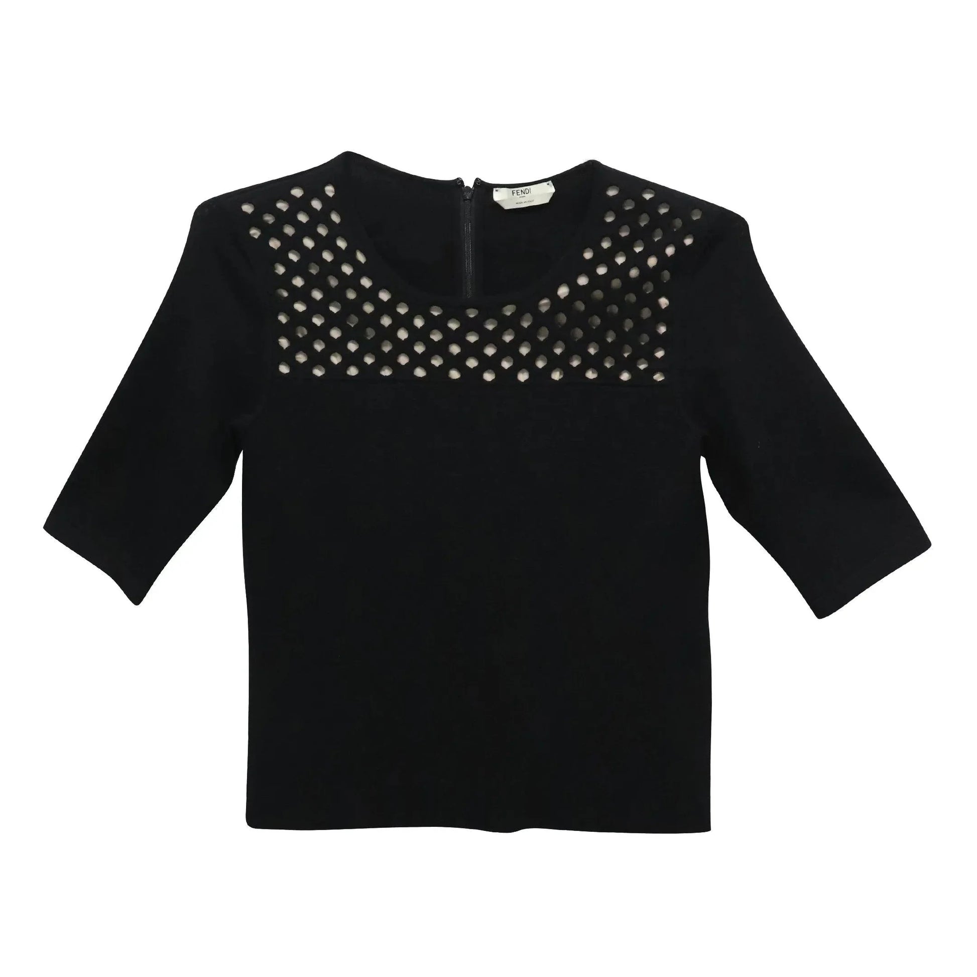 Fendi short sleeve top in black knit with perforated detailing on the chest and nude underlay. Features a round neckline and zipper down the back.