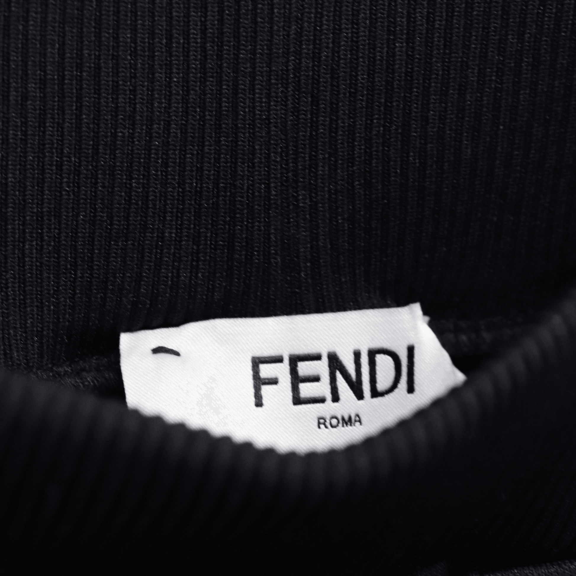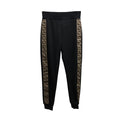 Fendi track pants in black cotton with a brown monogram logo stripe down the sides, a ribbed waist and cuffs, and side seam pockets.