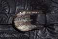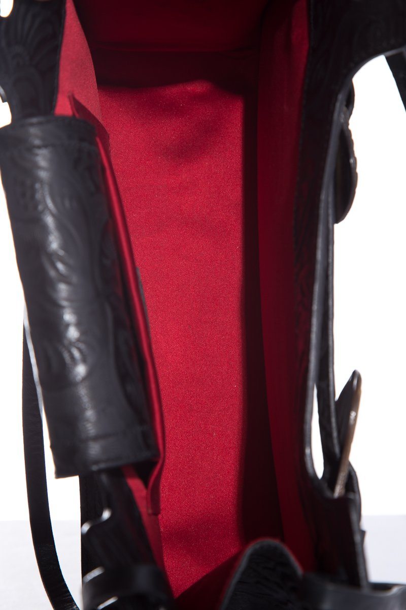 Black leather vintage Fendi embossed flower handle bag with dual shoulder straps, brown buckle accent at front, and red satin interior lining featuring single slip pocket. This item is in good condition.
