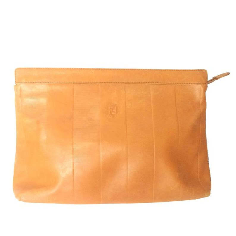 This is a vintage classic design orange brown leather clutch bag, mini document purse from FENDI in approximately from the 80s through the early 90's.