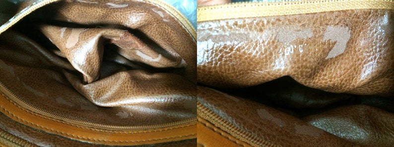 The exterior show some visible scuffs, scratches, and darkening due to use and age Partially the interior linings have sticked lining coatings, and some tears are also seen in the interior pocket as seen in the photo.