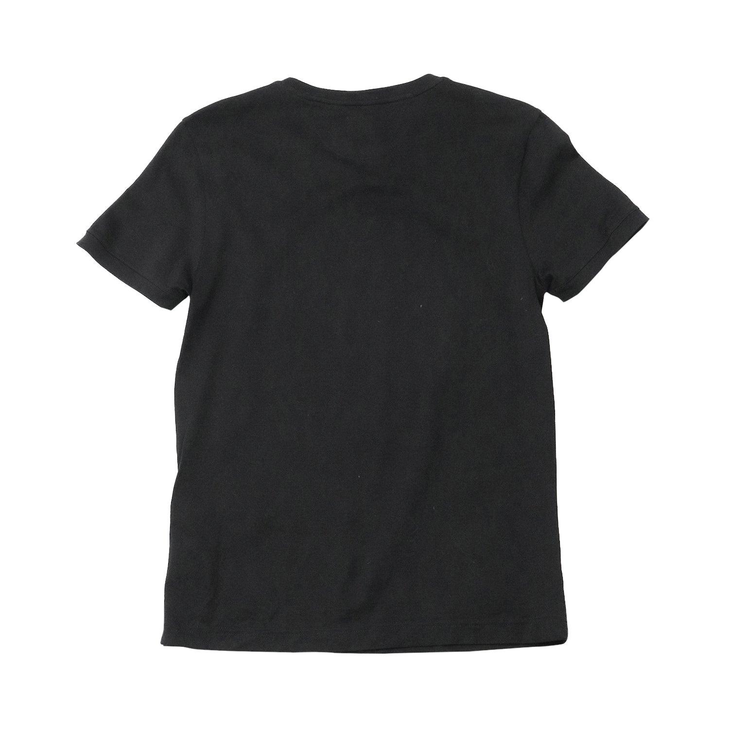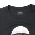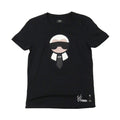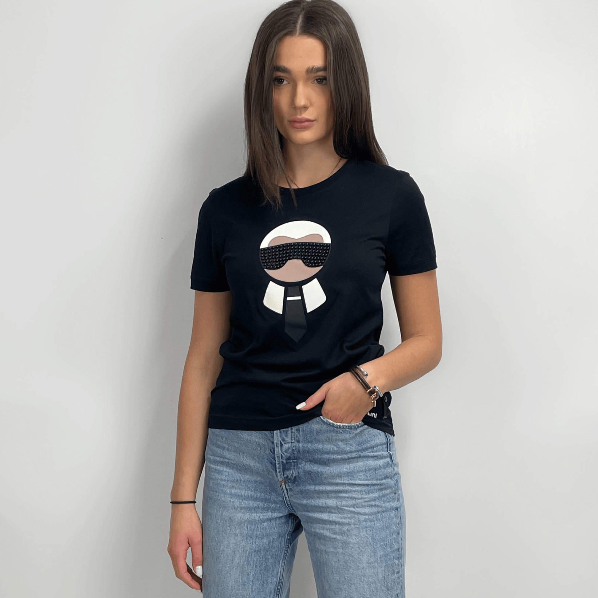 Fendi 'Karl' T-Shirt in black cotton with Karl graphic in white-black leather patches and black studded sunglasses