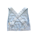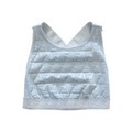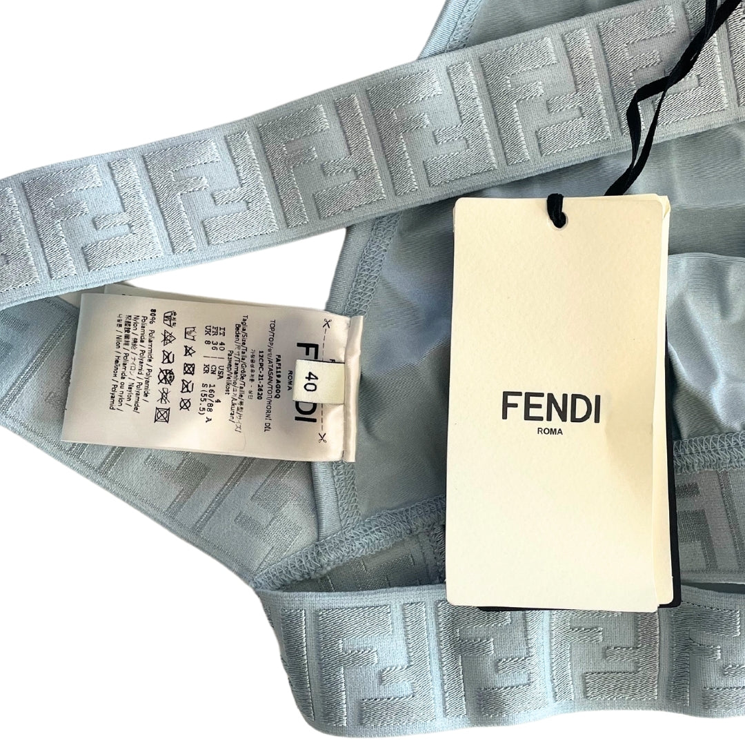 Fendi workout bra top in shiny baby blue with light blue rubberized monogram logo pattern throughout. Features an embroidered logo monogrammed elastic hem and crossed straps with an open back.