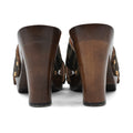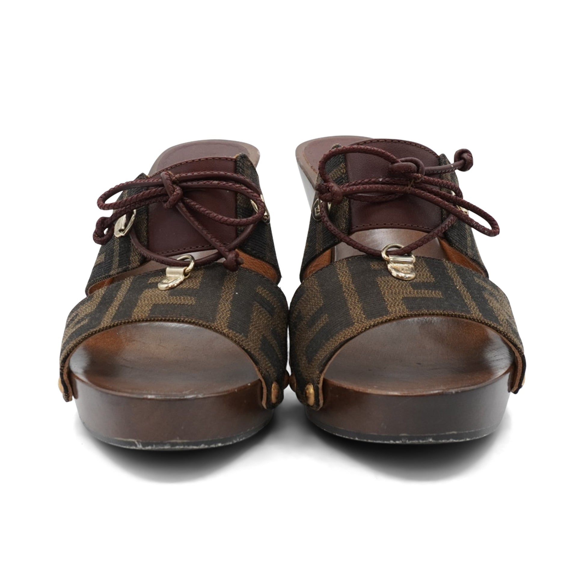 Fendi mules with Zucca monogram canvas straps with brown wood soles and burgundy lace up detail