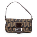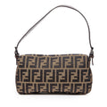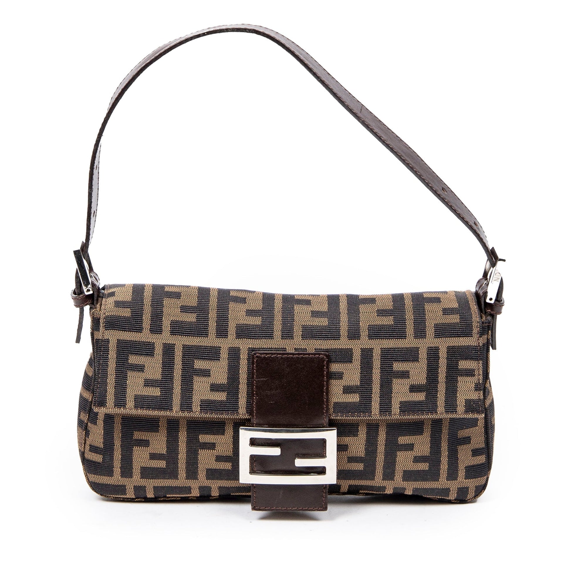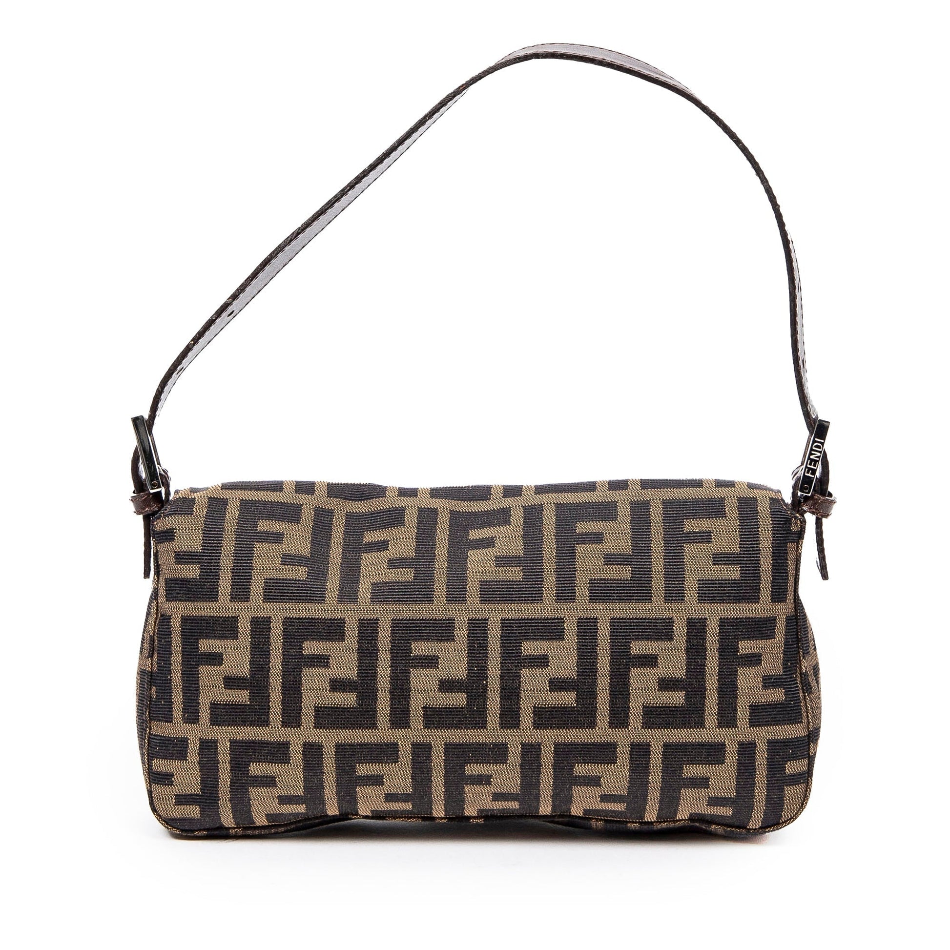 The baguette features a canvas body, a flat leather strap, a front flap with a flat leather strap and metal hardware, and an interior zip pocket.