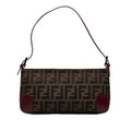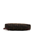 This baguette features a canvas body with leather trim, a flat leather handle, a top zip closure, and an interior zip closure.