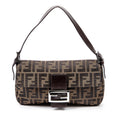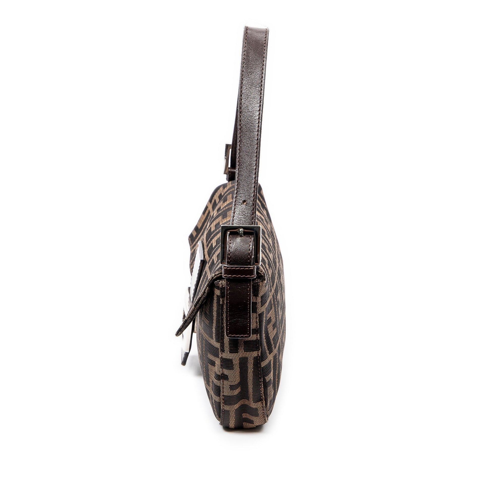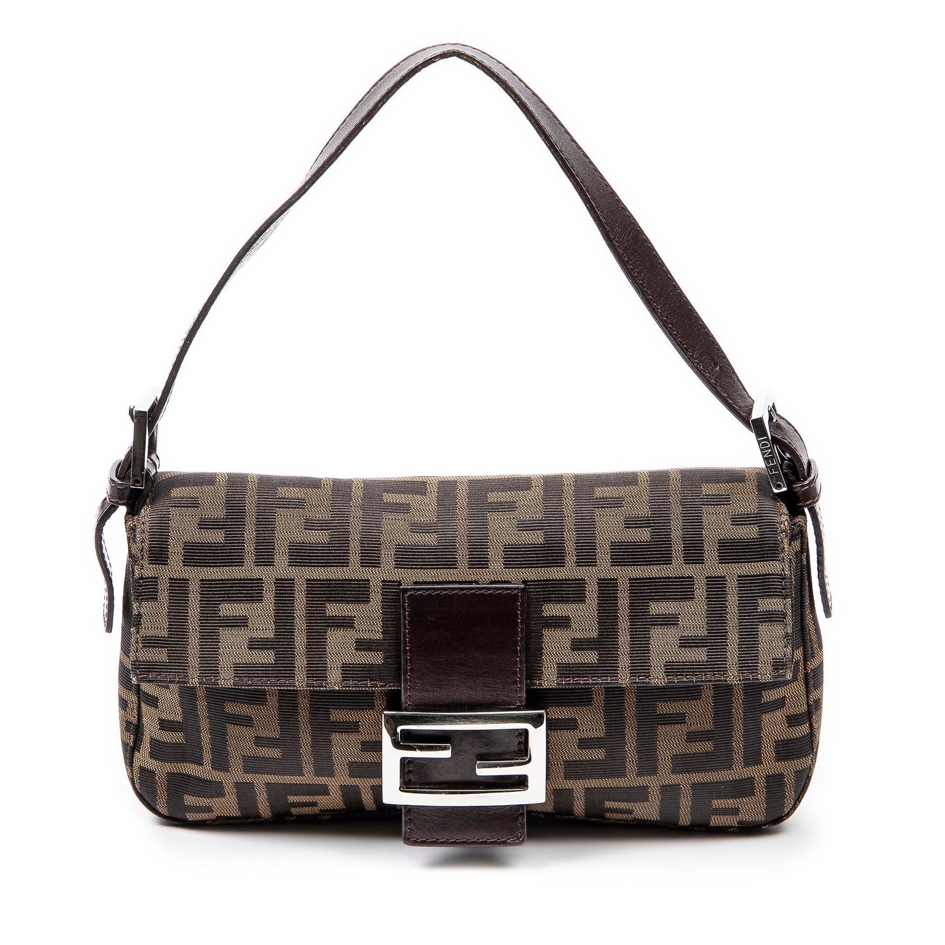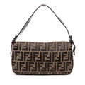 The Mamma baguette features a canvas body, a flat leather strap, a front flap with a flat leather strap and metal hardware, and an interior zip pocket. Comes with dust bag
