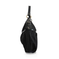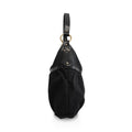 Fendi shoulder bag in black zucca monogram printed canvas with black leather trim, a shoulder strap with soft gold stud hardware, and a circular logo pendant charm. The bag has a top-zip opening revealing a black canvas interior lining with a zip pocket.