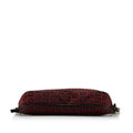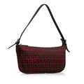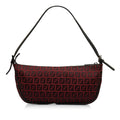 This baguette features a canvas body, a flat leather strap, and a top zip closure.