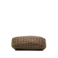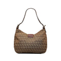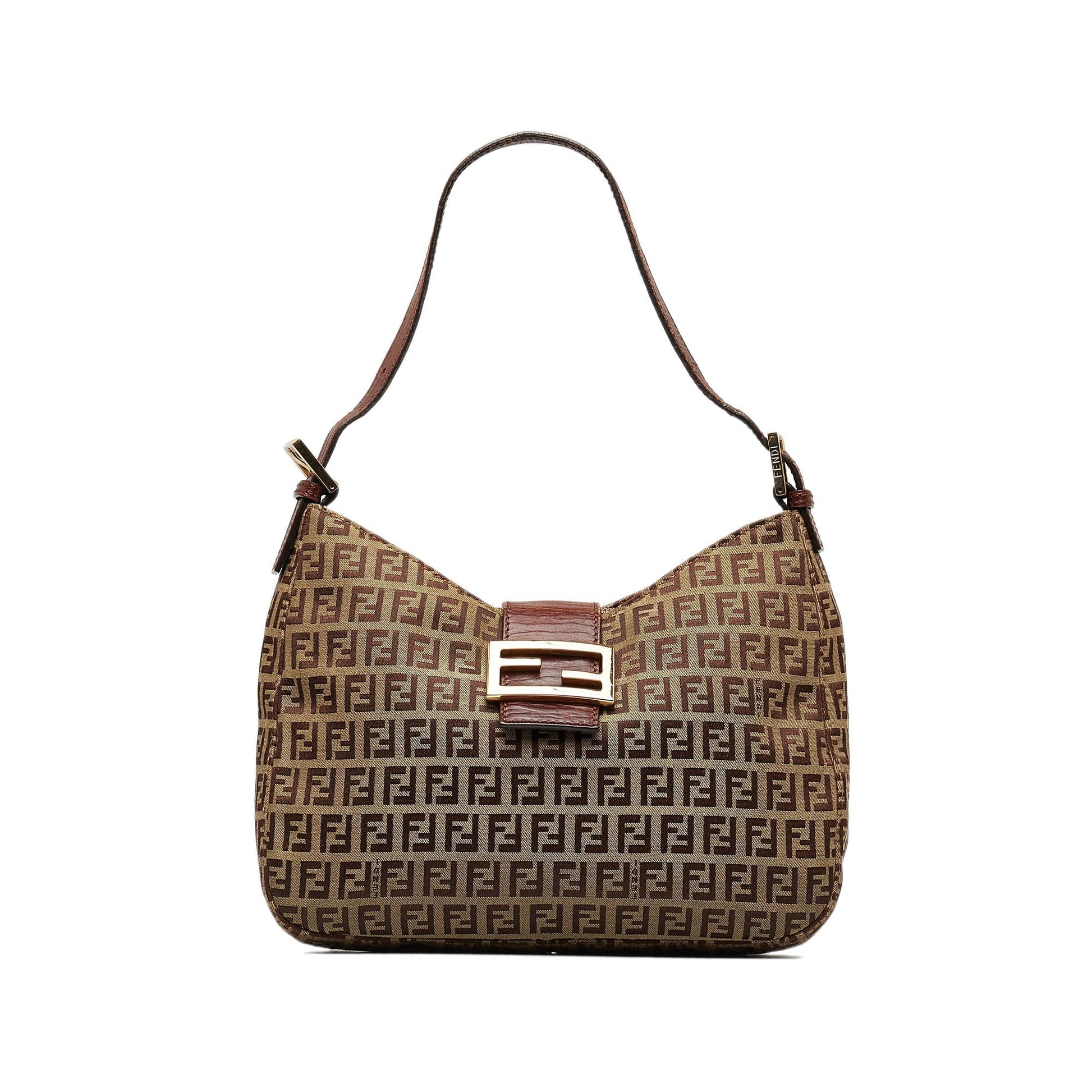 This shoulder bag features a canvas body, a flat leather strap, a front strap with a magnetic closure, and an interior zip compartment. Comes with dust bag