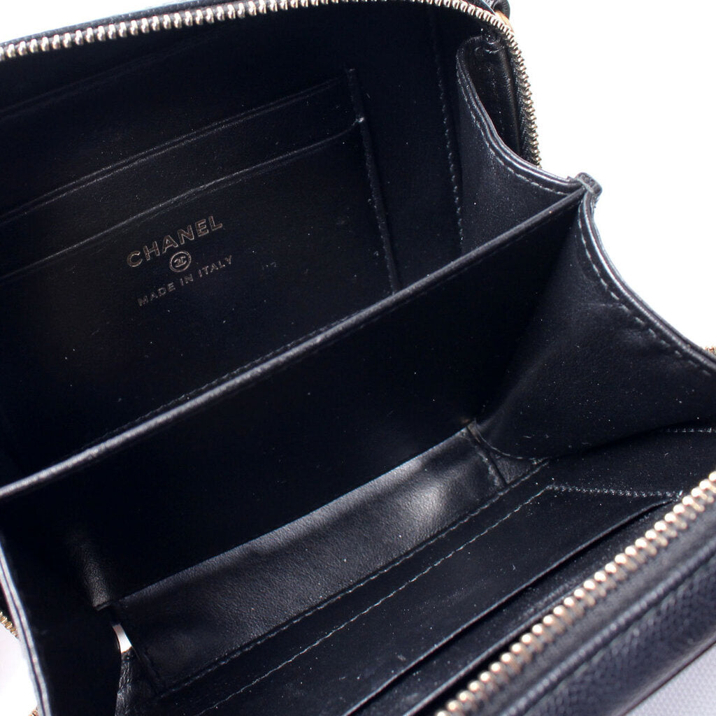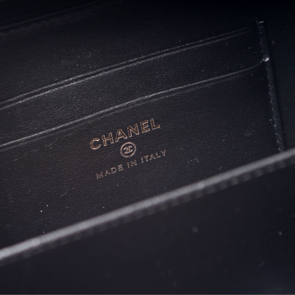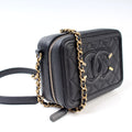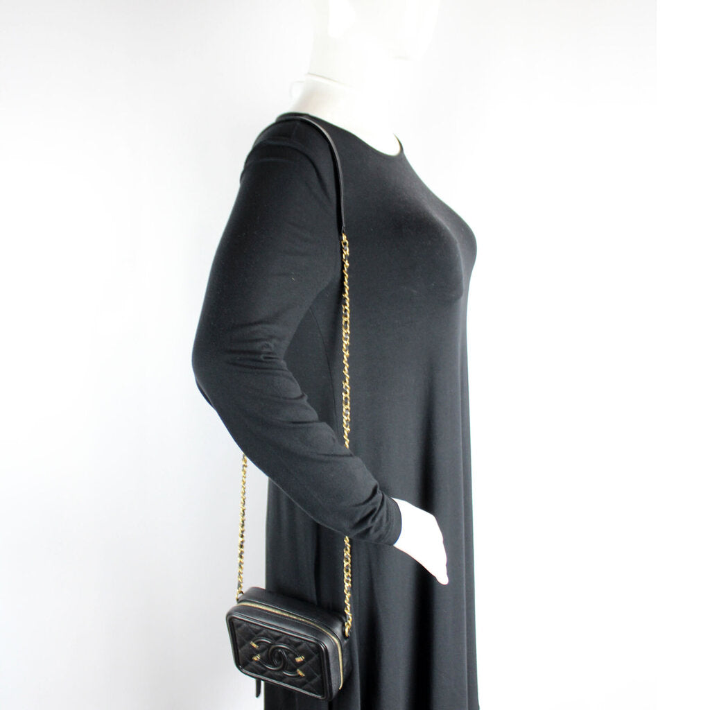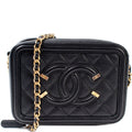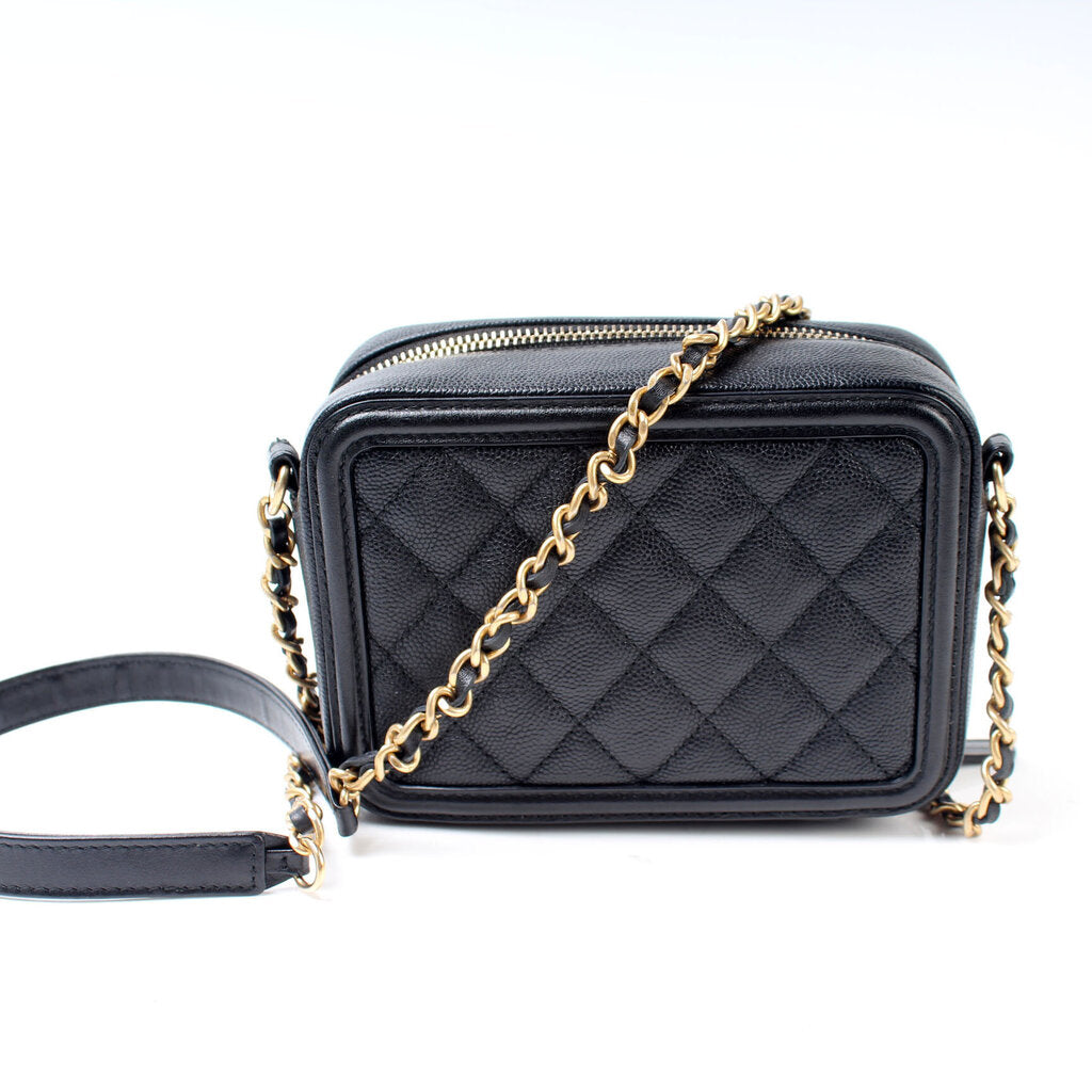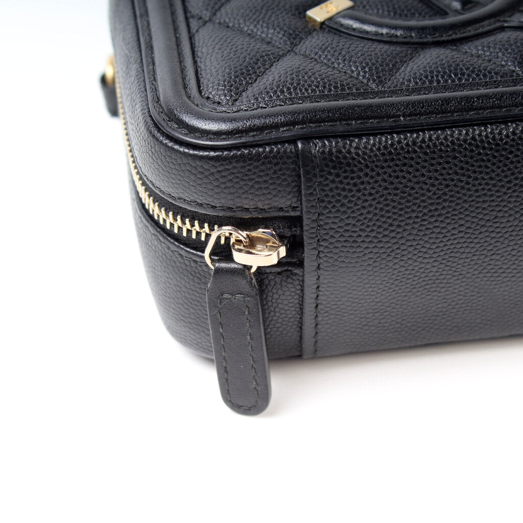 This Chanel Filigree Vanity Clutch W/Chainis eye catching bag. It is in the classic Caviar leather.