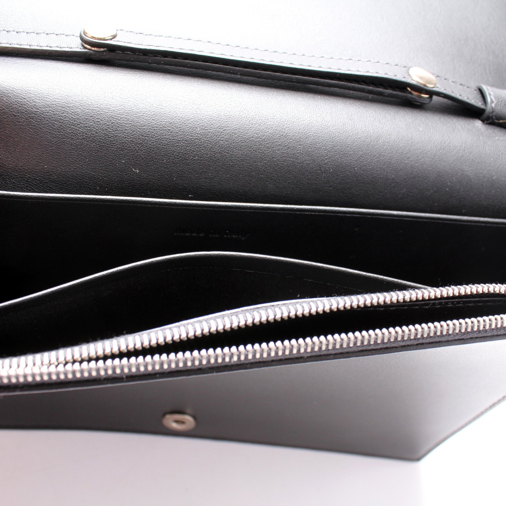 Interior: The interior is clean and free of rips or tears. The interior features one zip closure pocket, two open pockets, and eight card slots.