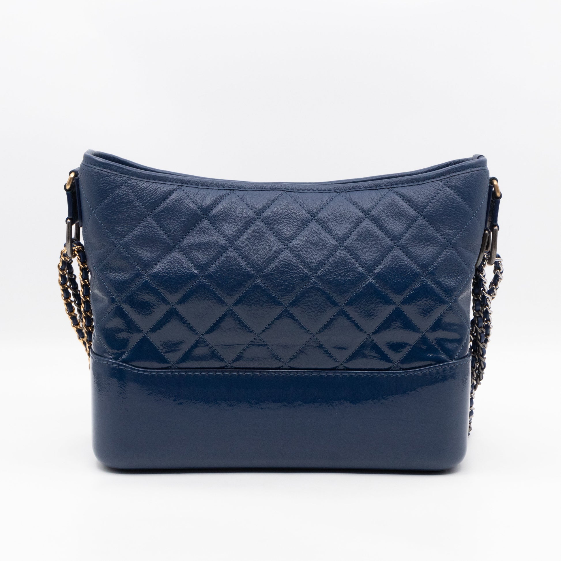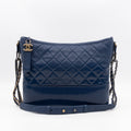 Chanel's Gabrielle Hobo is a modern crossbody bag in large size. This is made with a stunning design that seamlessly flows from goatskin leather to patent leather in dark blue, with double chains in gold, silver and ruthenium-toned metals. The chains can be combined in to different styles from crossbody to shoulder carrying. Top can be fastened with a zipper that has a CC charm, inside is spacious for daily use as the large size easily fits all daily items.