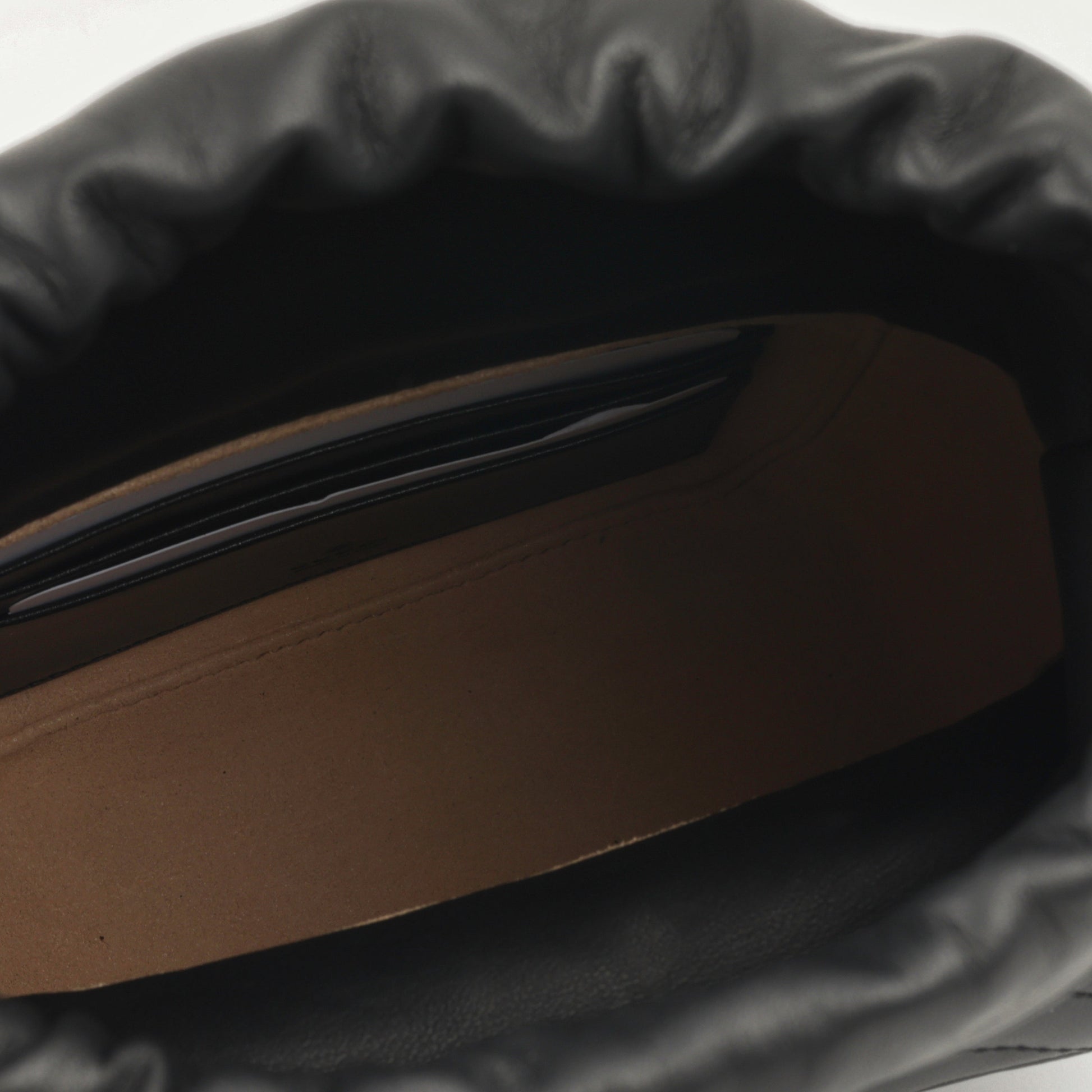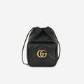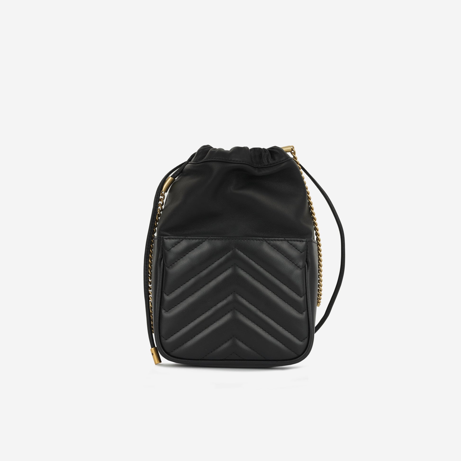 The GG Marmont collection introduces a mini bucket bag in black matelassé leather with a chevron motif. Inspired by a '70s archival design, it features the iconic Double G emblem on the front. With a chain strap and drawstring closure, this versatile bag can be worn as a crossbody, combining vintage elegance with modern functionality.