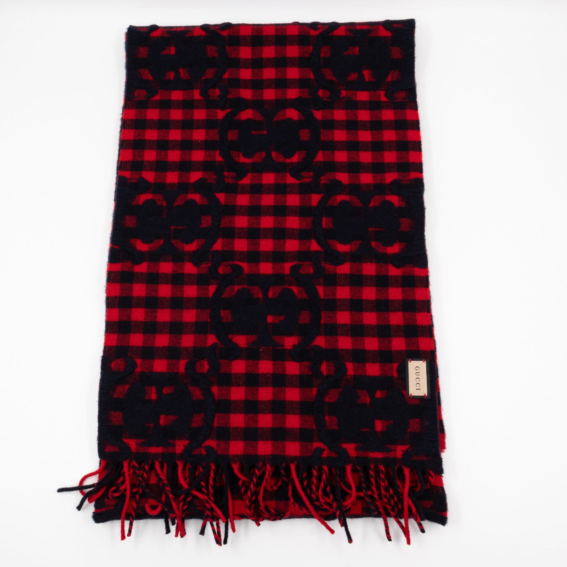 A stylish Gucci scarf is a must have accessory for the cold days of any season. This wool scarf brings warmth in style. It has a double sided GG pattern with plaid tartan. Made in red and dark blue, with the classic stripe design on the side.