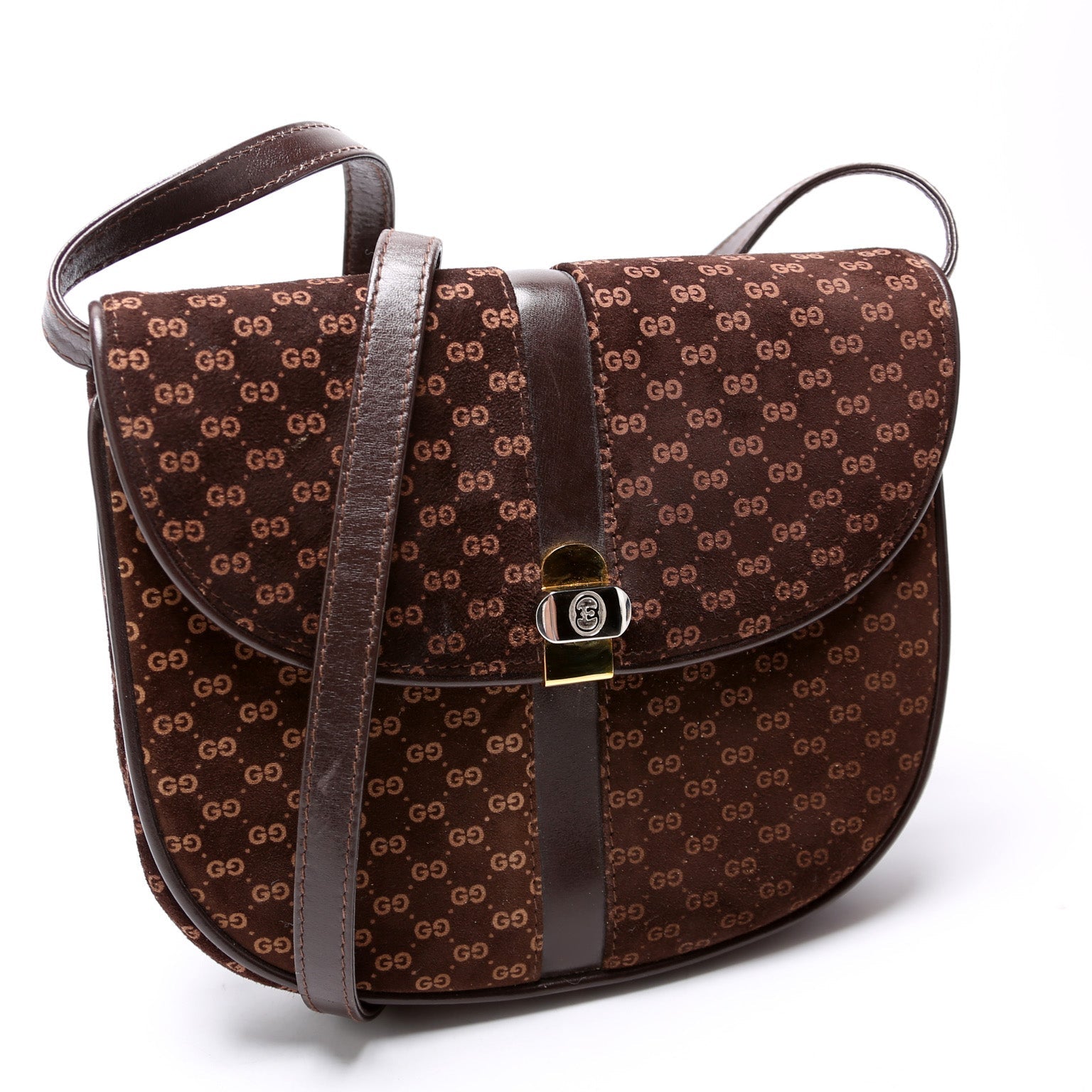 This Gucci GG Suede Flap Suede Bag Vintageis eye catching bag.